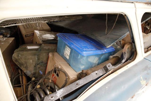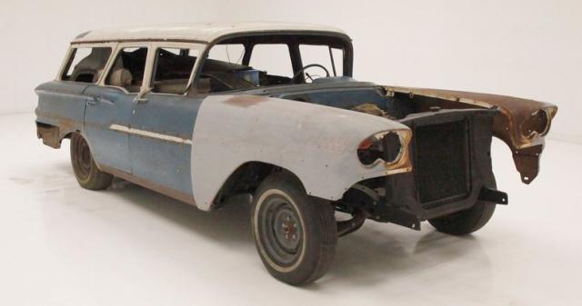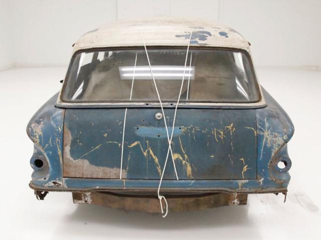 Some bare metal with surface rust, Fathom Blue patina painted panels and fully painted cream roof are making up the current state of this car. Dubbed the mini Cadillac, this was Chevy\'s mid range car and was given the designation by the quad front headlights. This station wagon is large enough to hold all the parts which present in list form for your inspection when you are making up your mind on what color to paint it when you finish the work!