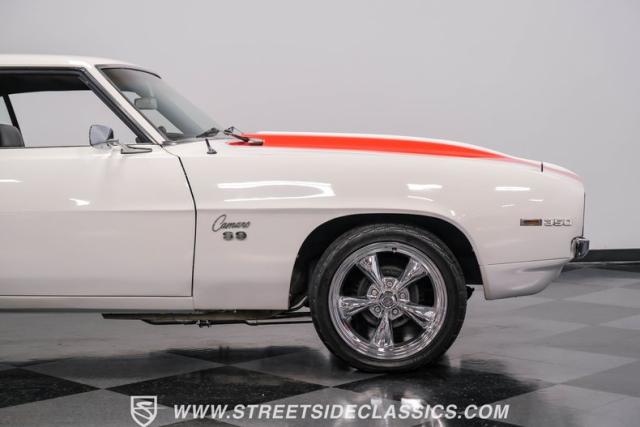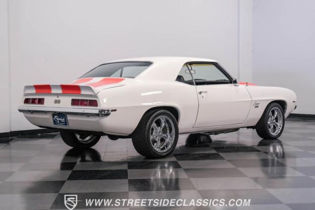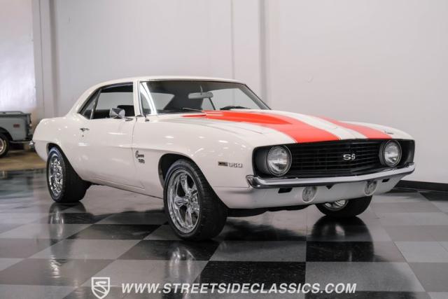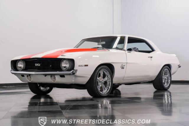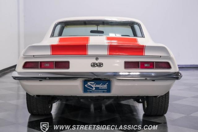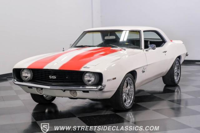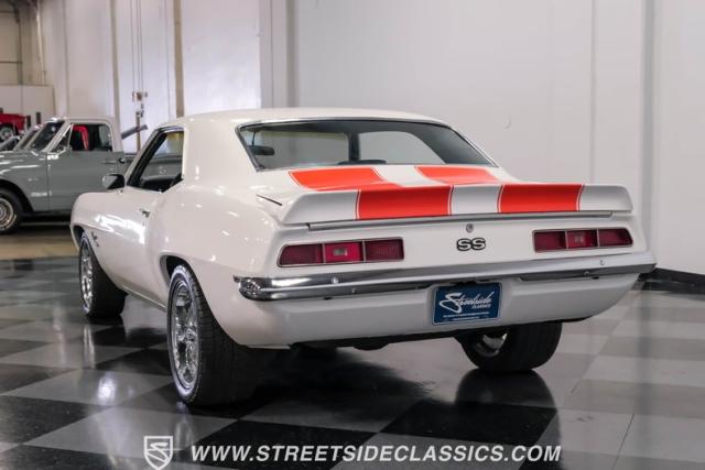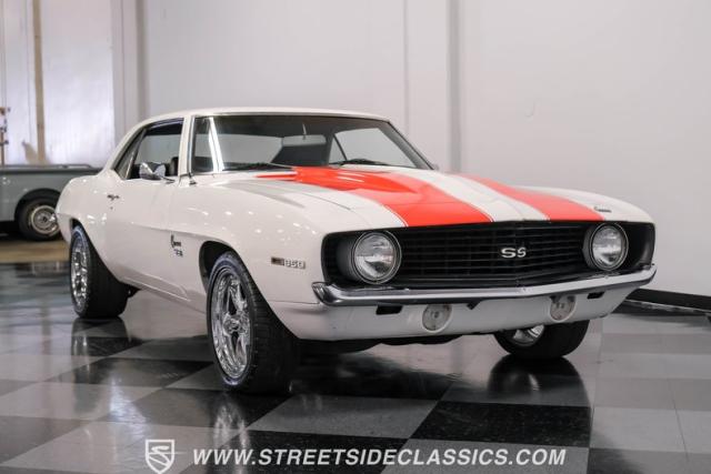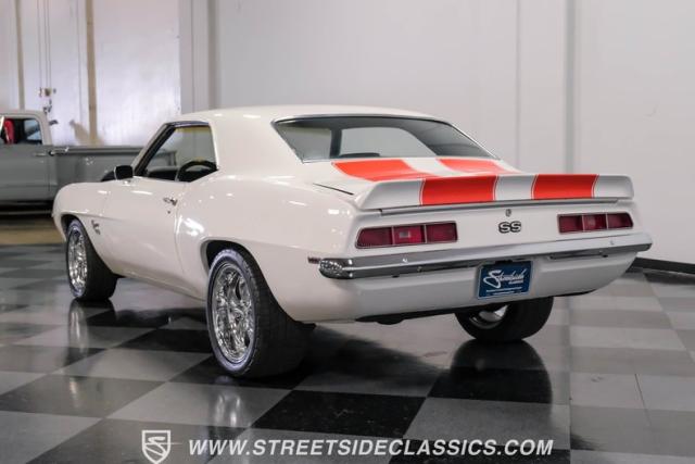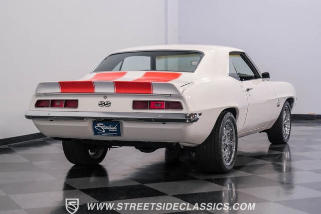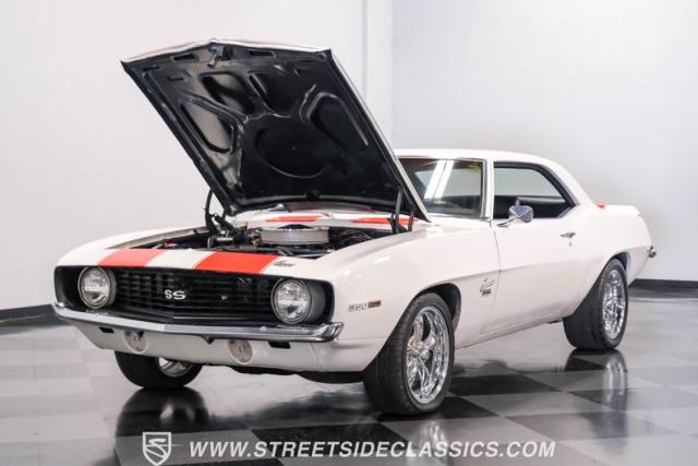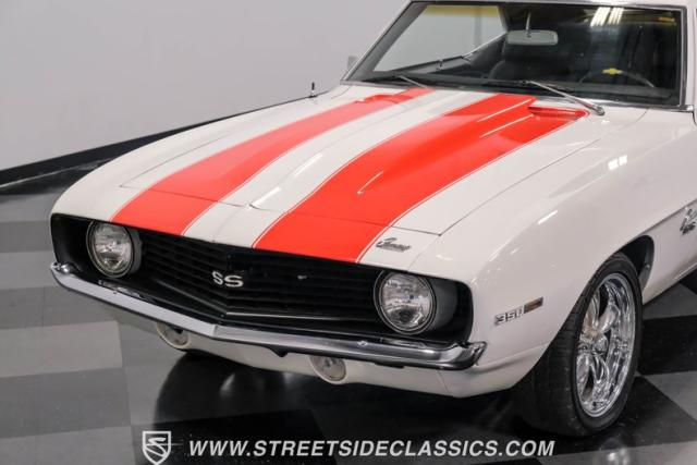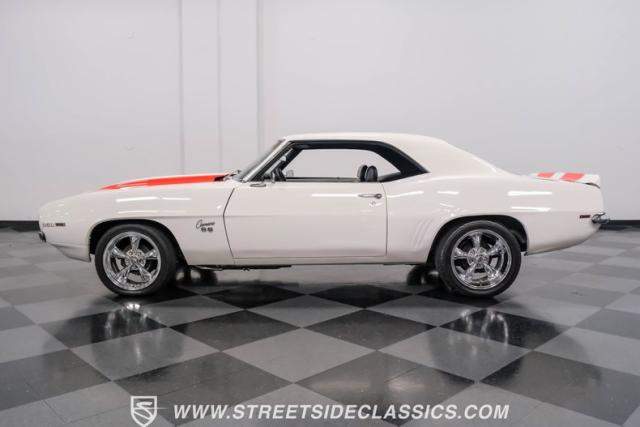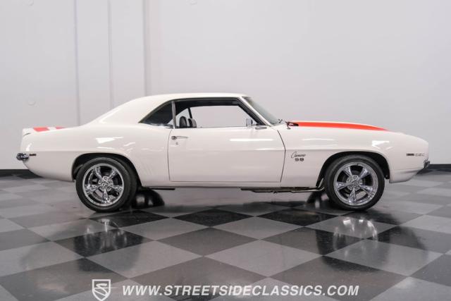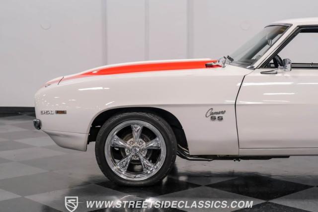 Bright White and roaring with personality, this 1969 Chevrolet Camaro SS Tribute is an icon of American muscle. The paint gleams under the sun, complemented by bold Indy Pace Car inspired Hugger Orange racing stripes that underscore its performance pedigree. A set of 17-inch chrome Ridler wheels wrapped in 225/45R17 front and 275/40R17 rear tires ensure this beast is as ready for the open road as it is for the boulevard. The cowl hood and rear spoiler hint at its powerful nature, while the chrome bumpers add just the right amount of flair.