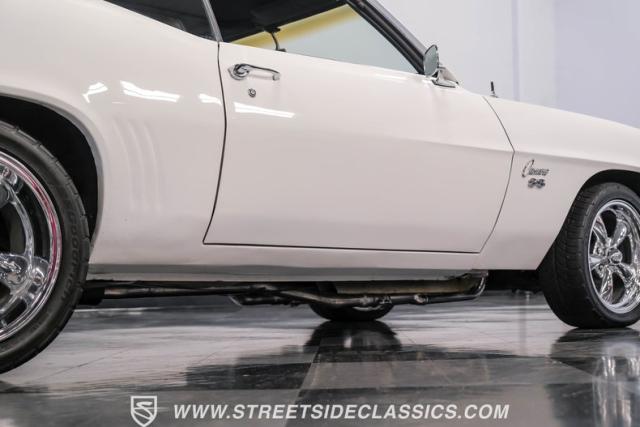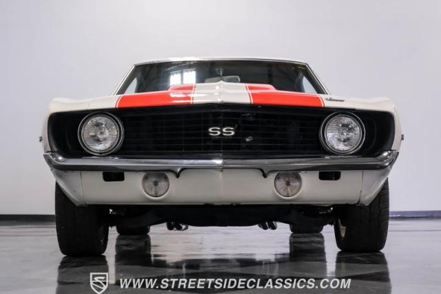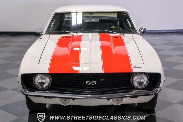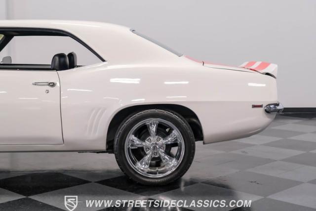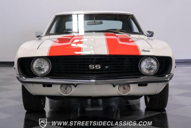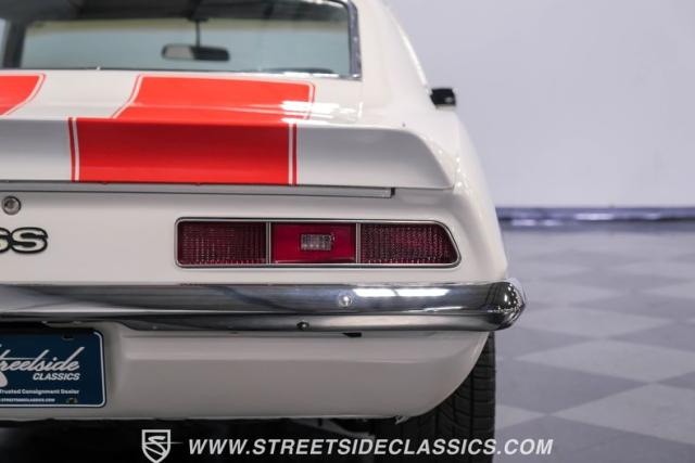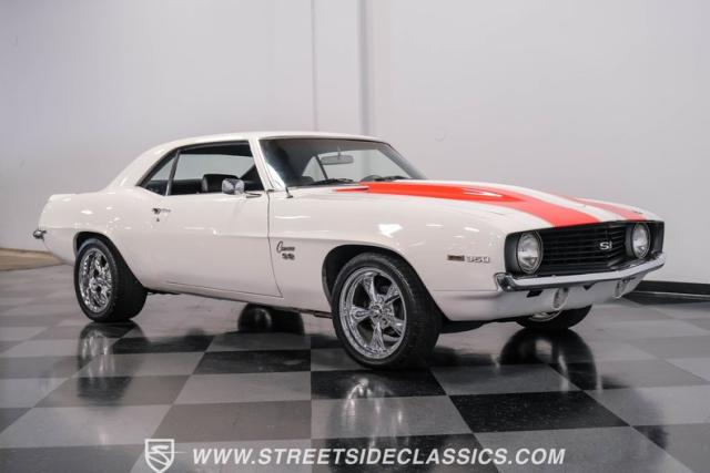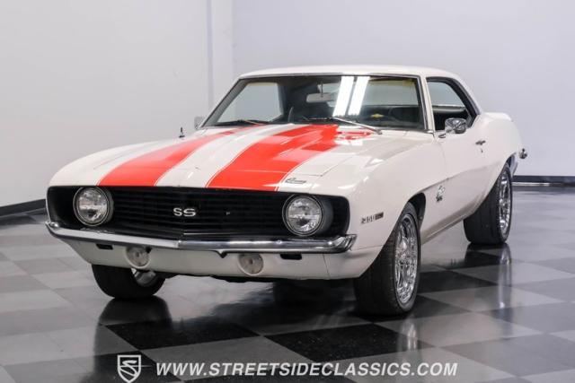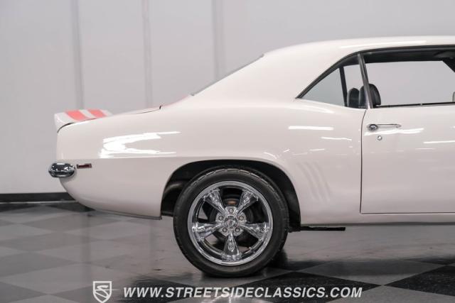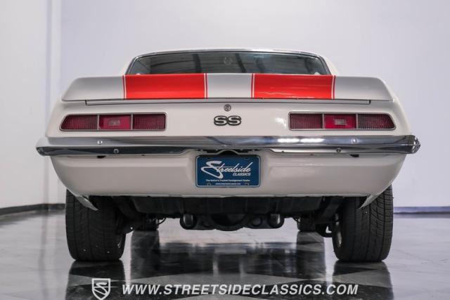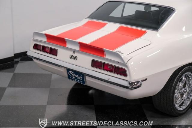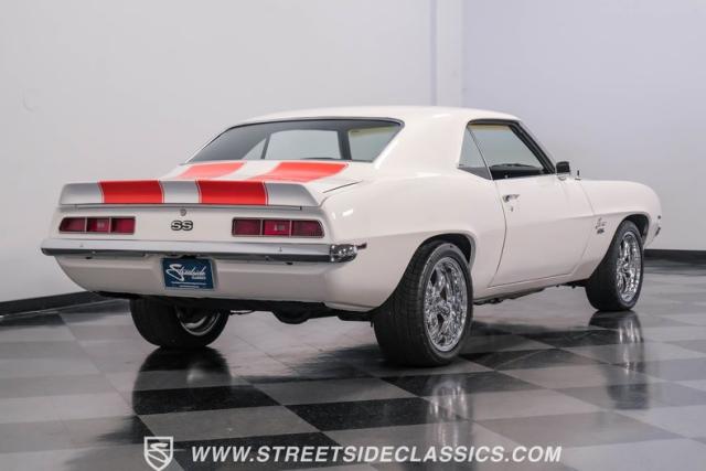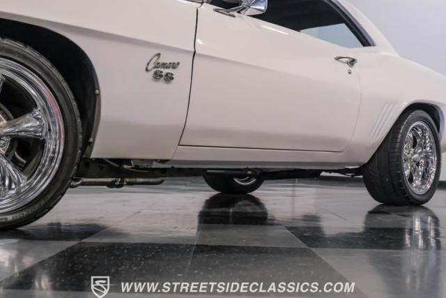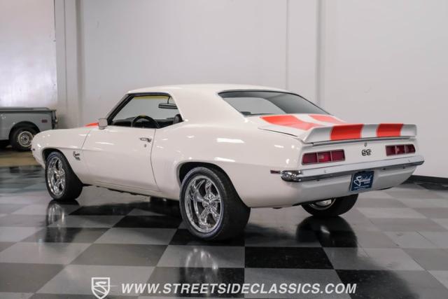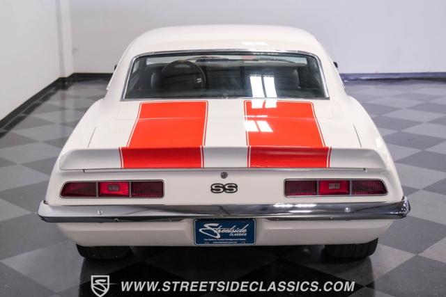 Bright White and roaring with personality, this 1969 Chevrolet Camaro SS Tribute is an icon of American muscle. The paint gleams under the sun, complemented by bold Indy Pace Car inspired Hugger Orange racing stripes that underscore its performance pedigree. A set of 17-inch chrome Ridler wheels wrapped in 225/45R17 front and 275/40R17 rear tires ensure this beast is as ready for the open road as it is for the boulevard. The cowl hood and rear spoiler hint at its powerful nature, while the chrome bumpers add just the right amount of flair.
