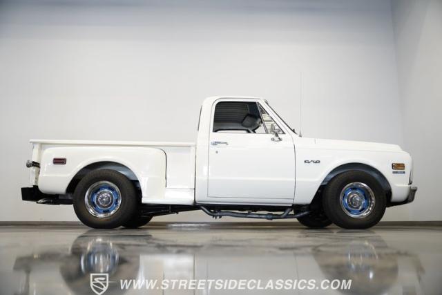 Here we have a 1970 Chevrolet C10 Stepside short-bed pickup that presents itself very well. The white exterior paint is smooth, glossy, and free of any major flaws. The blue pinstriping pairs nicely with the blue-painted wheels, which feature chrome-plated center caps and beauty rings. The blue-painted \"CHEVROLET\" letters on the tailgate look great and go smoothly with the cool rear custom bumper and the aftermarket LED lighting. The hood, fenders, doors, quarter panels, and roof all appear to be straight. The front bumper and grille are solid, and the wooden truck bed brings extra personality, capping off what is one remarkable-looking truck.