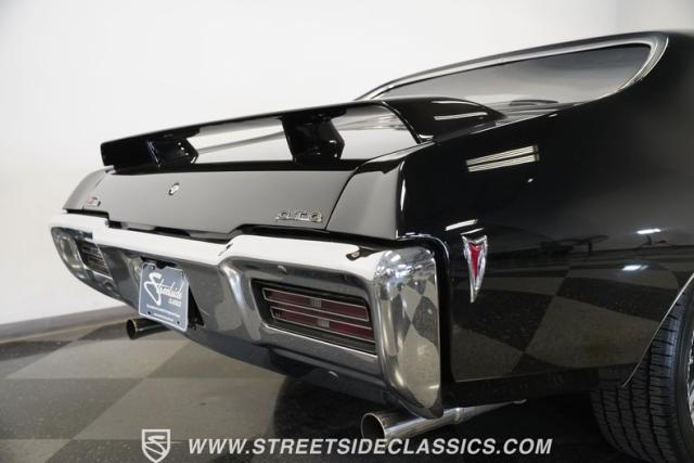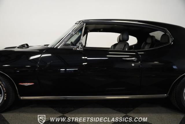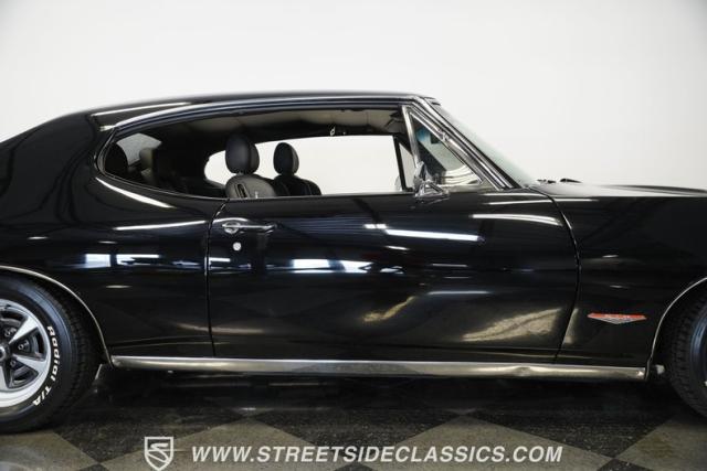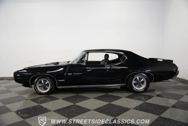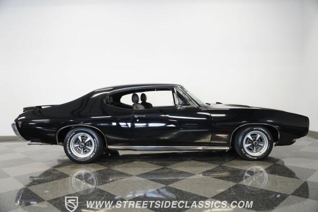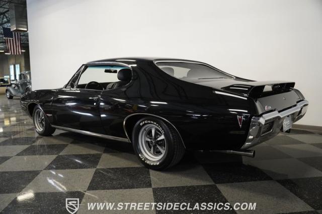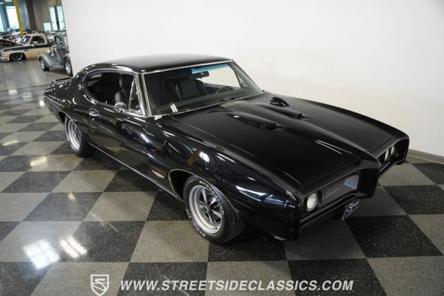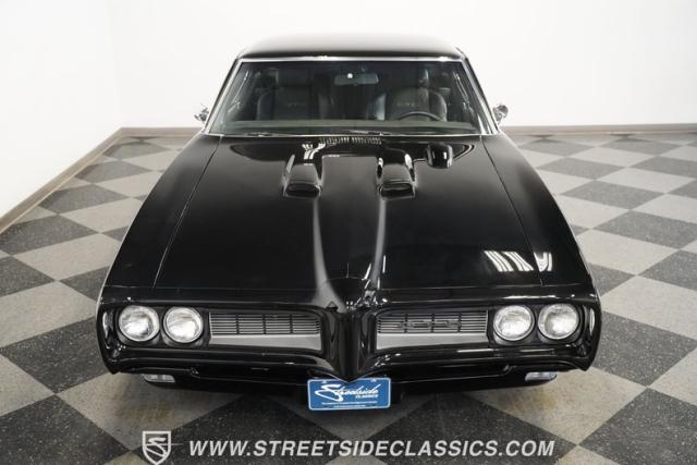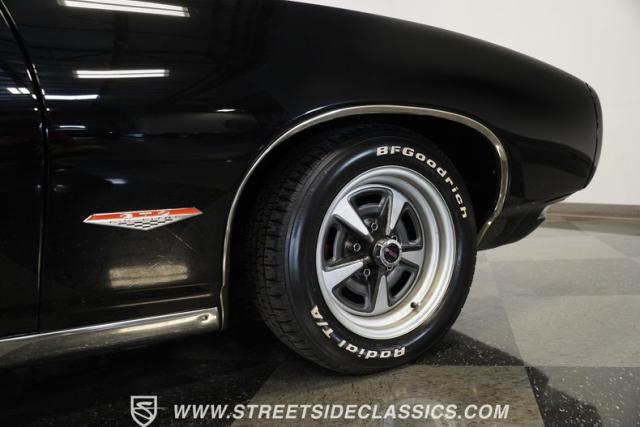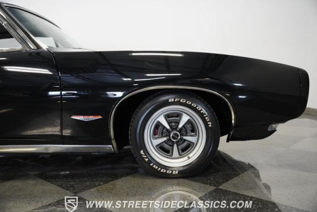 This 1968 Pontiac GTO, all muscle finished in a deep black that seems to stretch into infinity, asserts its dominance with more than just its color. Its distinctive hood, crowned with dual scoops and a hood tach, as well as a Judge style rear wing ad to the excitement. Perched on 15-inch Pontiac Rally ll wheels that anchor it firmly to the asphalt, its road presence is undeniable. The car\'s stance is aggressive, with BF Goodrich Radial T/A front tires sized at 205/60R15 and wider rear tires at 235/60R15, ensuring that every bit of power is translated directly to the road. This GTO makes an entrance with the unmistakable allure of American muscle.