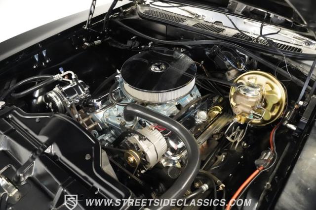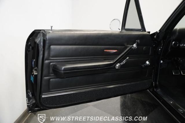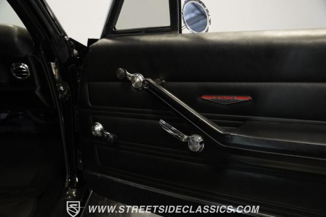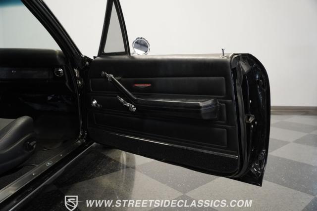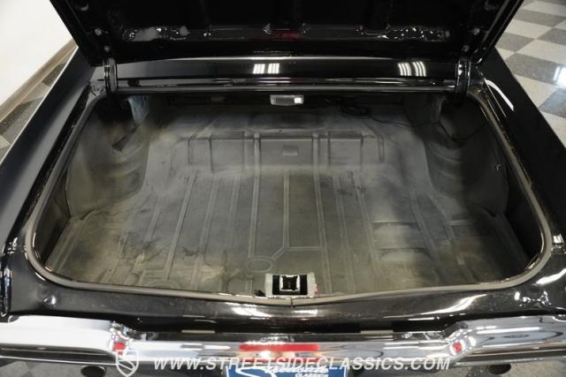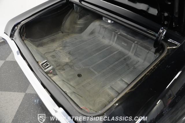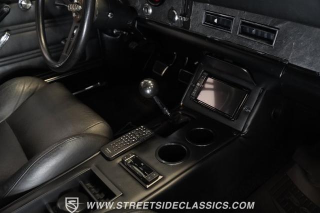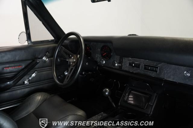 The interior, a sea of classic black, envelops you in an ambiance of vintage luxury. Luxurious leather bucket seats sourced from a late-model GTO offer a front-row seat to the road ahead, while the rear passengers enjoy the comfort of another pair of leather trimmed bucket seats. A custom console with cup holders houses JBL sound with Bluetooth controls and a Hurst shifter before sweeping up to house a Pioneer touchscreen infotainment center with remote. The custom dash face is fitted with a full set of red analog gauges by Speed Hut and a Vintage Air air conditioning system keeps the cabin cool.