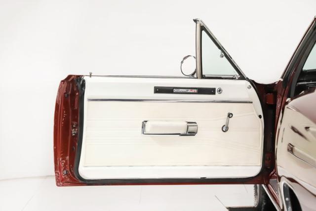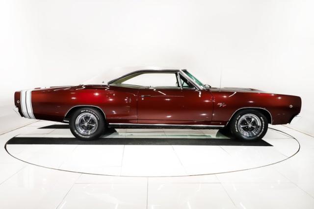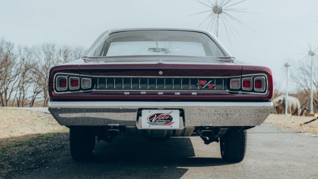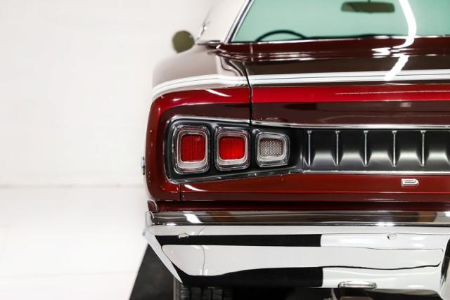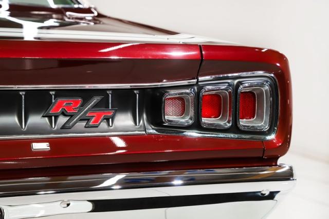 EXTERIOR: Ultra rare, highly desirable colors! The factory Burgundy paint has just enough metallic to make it shimmer. It is beautifully laid out and applied with great attention to detail. It also has a smooth and reflective finish. The rear bumblebee stripe is painted on and smooth to the touch. Looking down the side of the body it is straight as an arrow. The panels are well aligned with good gaps. The doors close easily with minimal effort. The Pearl White vinyl top is also a rare option, and in great condition. The hood bulge really looks tough. The blacked out front grille and headlights are in excellent shape. The blacked out tail panel with triple taillights is iconic. It has the correct R/T emblems. The chrome has a glorious shine. It\'s rolling on a set of 15\" Magnum 500 wheels wrapped in BFGoodrich Radial T/A tires.