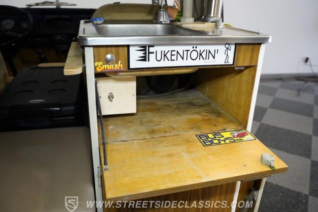Inside, the well-thought-out layout maximizes space with cloth front seats and a vinyl-upholstered rear bench that converts to a bed. A compact built-in sink and refrigerator demonstrate the intelligent design that made these vehicles popular among travelers. Additional features include household electrical plugs and a functional tachometer on the dash that tracks engine RPMs while maintaining the straightforward, utilitarian feel of this mobile living space.