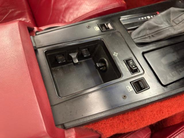 Red on red means just about everything on the inside is color matched, beginning on the door panels of molded plastic over a carpeted kick panel with speakers and hardware in black, both looking clean here. Up front, red leather bucket seats, high backed and supportive with some light patina creasing on the driver\'s side. After the leather wrapped steering wheel, it\'s all 80\'s with the C4\'s touted digital instrument cluster with arching graphics and segmented digits in square gauges with the center info controlled by a toggle panel to the right, just above the AM/FM/Cassette with CD changer and A/C panel, all in black with distinctive GM font. A flat center console houses the shifter and its leather handle and seat controls retreat to a cove in the console, just beyond window switches. The red carpet has held up very well and completely covers the footwells and rear cargo area that help confirm this car\'s low mileage and likely garaged existence. There are brackets to stow the glass targa top when open air driving is desired.