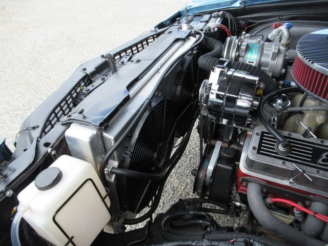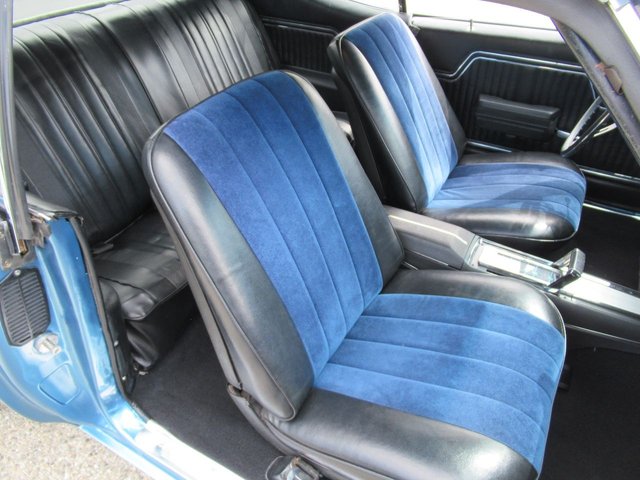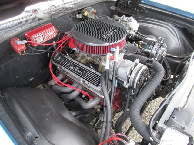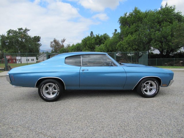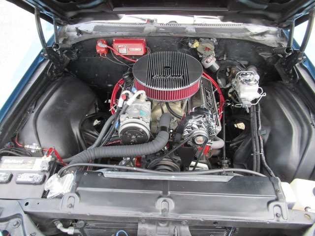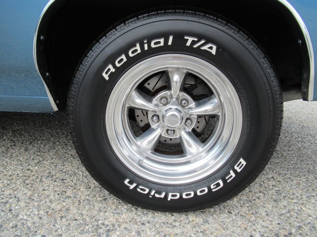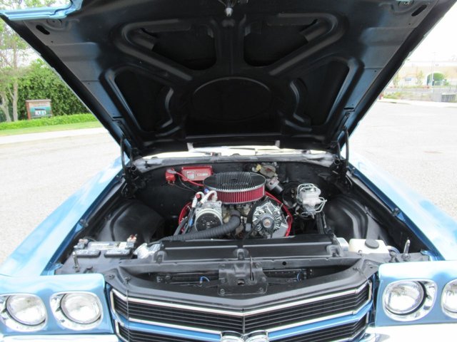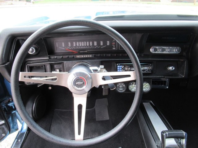 Check out this great looking Chevelle! This one is finished in Astro Blue Metallic with nice chrome and stainless trim, dual chrome mirrors, 15 inch staggered Polished American Racing wheels wrapped in new BF Goodrich T/A radials to fill up the wheel wells. Under the Cowl induction hood sits a small block 400 V8 with a 4 bolt main and options include Camel back heads, Edelbrock Aluminum intake, Edelbrock 4 barrel carburetor, Edelbrock engine dress up kit, MSD Distributor, Aluminum Radiator with dual electric fans, power steering, Hydroboost 4 wheel disc brakes, Headers with Flowmaster mufflers and dual exhaust exiting where it should. Power gets sent to the pavement through a 3 speed Turbo 350 Automatic transmission followed by a 12 Bolt Posi-Traction rear differential with a 3.55 ratio for a little added traction. The interior consist of Black vinyl bucket seats with comfortable Blue cloth inserts, center console with Horseshoe shifter, upgraded tilt steering column with 3 spoke comfort grip steering wheel, under dash 3 pack gauge set up, Alpine AM/FM CD Stereo with Auxiliary port and new Vintage A/C with upgraded 134 Freon for those hot summer days. Much cheaper than a Super Sport and just as much fun!