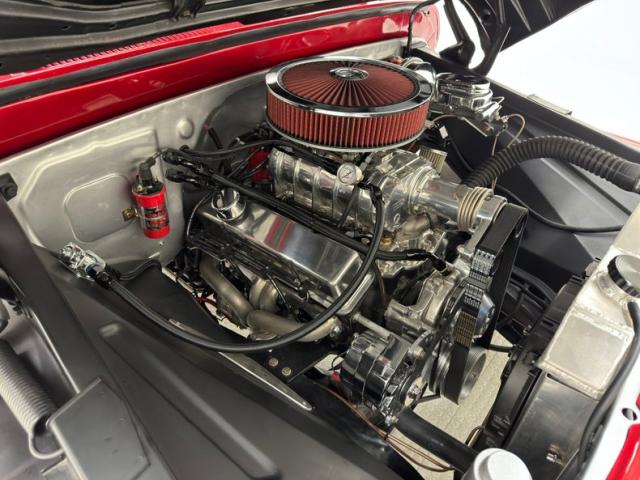 The door panels, and much of the interior carries over the candy apple paint, and a black leather insert adorns the door and frames the hardware. Black leather bucket seats feature diamond stitched inserts and the driver\'s seat has power controls. Both have a lap belt that connects on the outside instead of the inside and the diamond stitching continues on the back panel behind the seats. Remember that forward leaning A-pillar? It creates a curved body line with the door open and brings with it the wrap-around windshield in a fantastic design feature from GM. A Flaming River chrome tilt steering wheel wears a showy 4 spoke steering wheel and it all leads to a polished dash insert that houses Dolphin black faced gauges in a gleaming, show quality presentation. The center stack starts the custom console and it is where we find two more gauges, white faced this time, and a Retro Sound AM/FM radio with Bluetooth. Between the seats, a B&M ratchet shifter, rubber booted and chrome based, is backed by a couple of stainless cup holders. Plush black carpet covers the floor, not perfectly conforming with the body, but in clean condition and topped with protective rubber mats. The walls, pillars, and ceiling all shine with red paint.