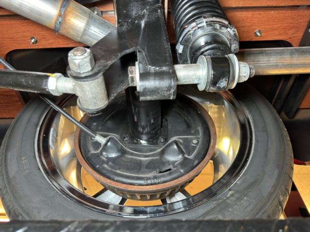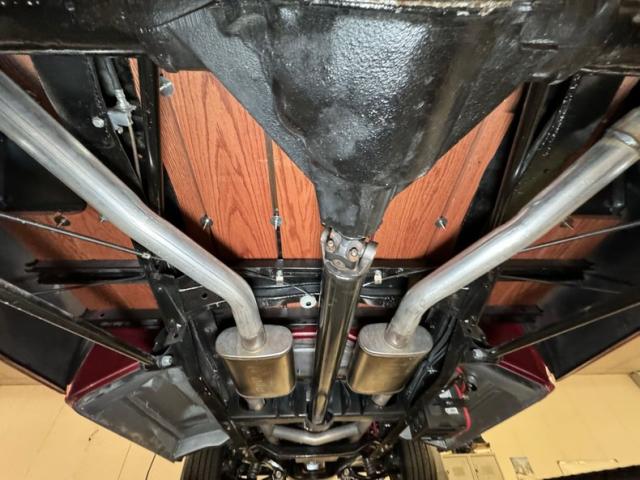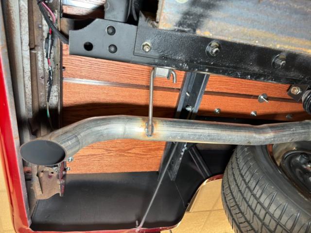 Normally the backstage area of a show isn\'t such a great looking place. But the undercarriage here is very clean and there is nothing to hide! The satin black frame guides the dual exhaust back where, following an H-pipe, FlowMaster Flow FX mufflers interrupt the volume before exiting discreetly in downturned tips behind the rear roll pan. The new wood planks look almost as good underneath as they do on top, and a chrome differential cover adds a bit of shine. One drop of oil on the pan represents all errant fluids we were able to find and the wheel components are clean as a whistle. Coil overs occupy the QA1 suspension in front and a 4 link with coil overs is found in back.