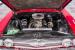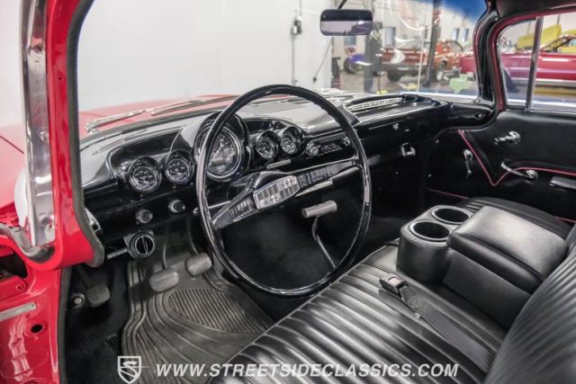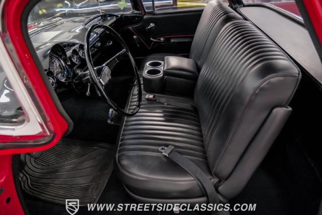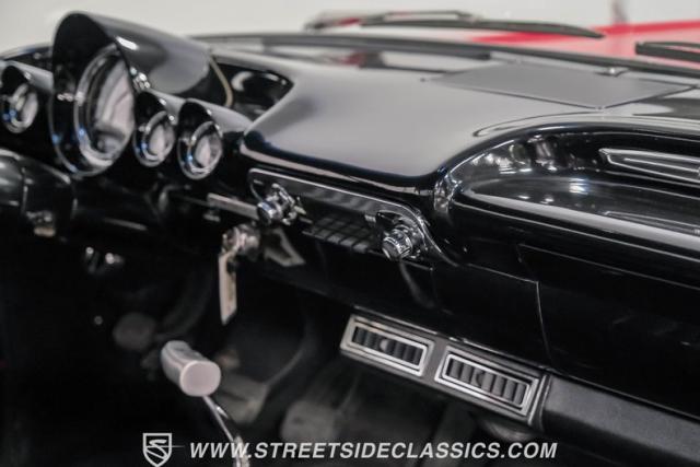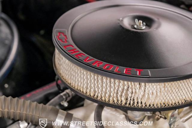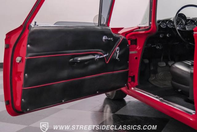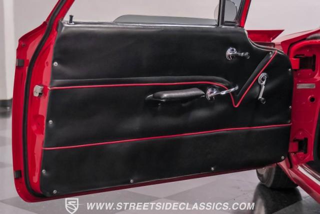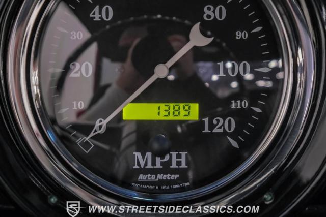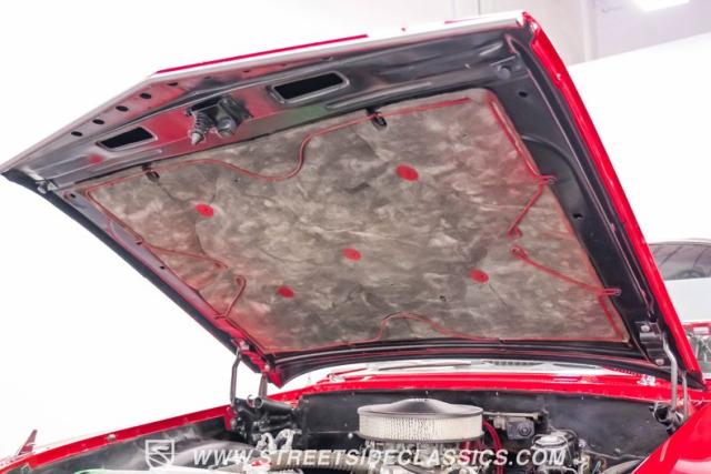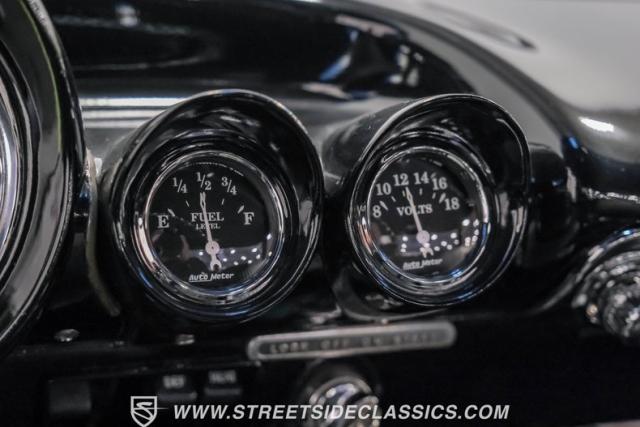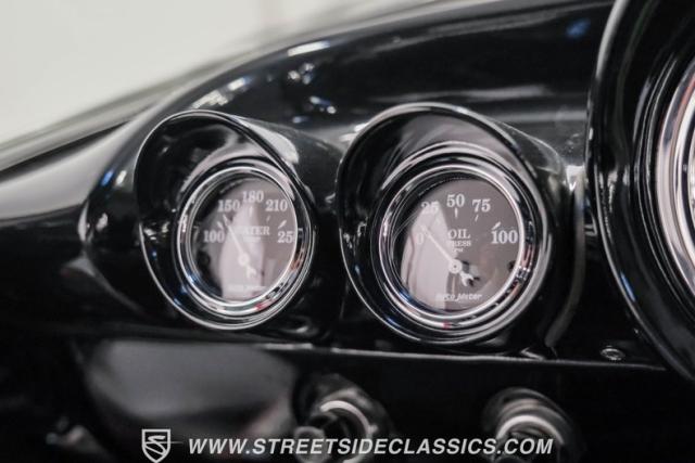 Black vinyl covers the bench seat, creating a stark contrast with the exterior color scheme. The dashboard, painted to match the body, houses AutoMeter gauges for accurate readings. A Retro Sounds AM/FM/Aux radio blends vintage aesthetics with modern functionality. The Hurst shifter, complete with its iconic T-handle, takes center stage on the floor. Aftermarket air conditioning integrated into the stock controls provides modern comfort. An armrest with built-in storage and cup holders adds convenience. New carpets and headliner complete the freshly restored interior, creating a cohesive and inviting space for driver and passenger alike.