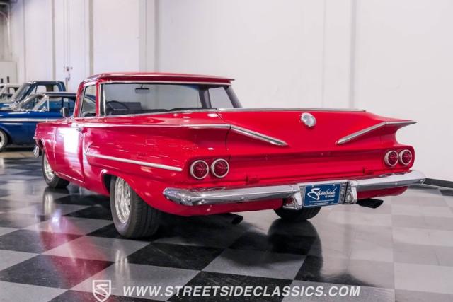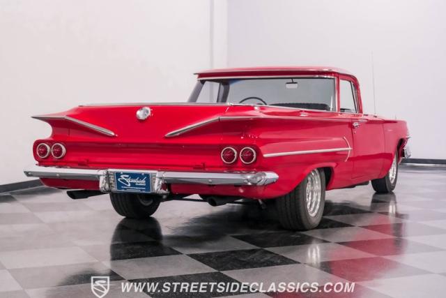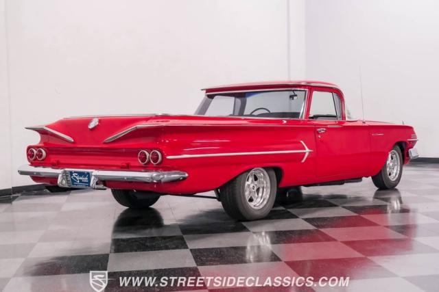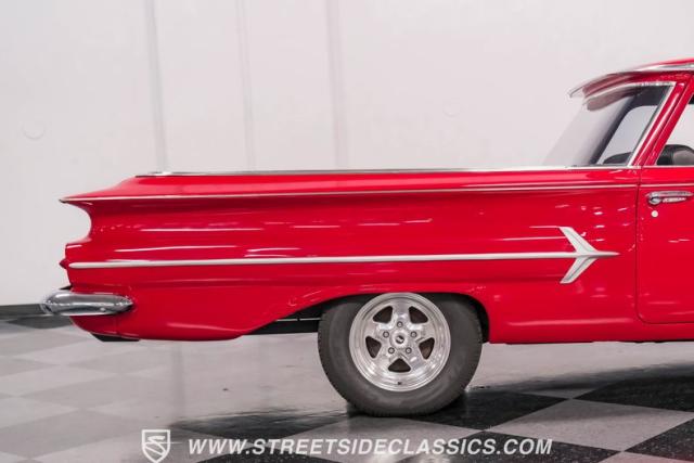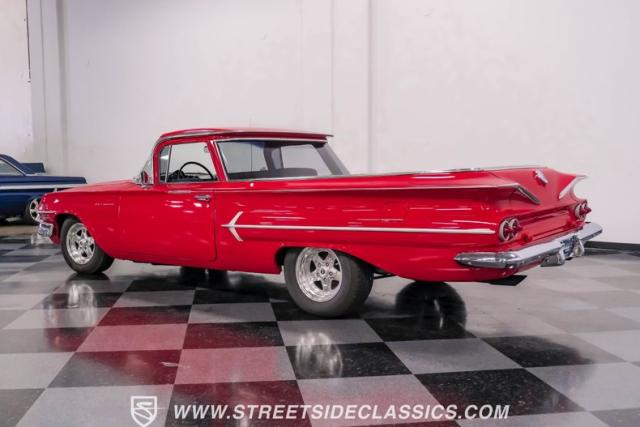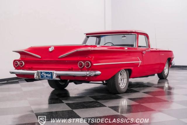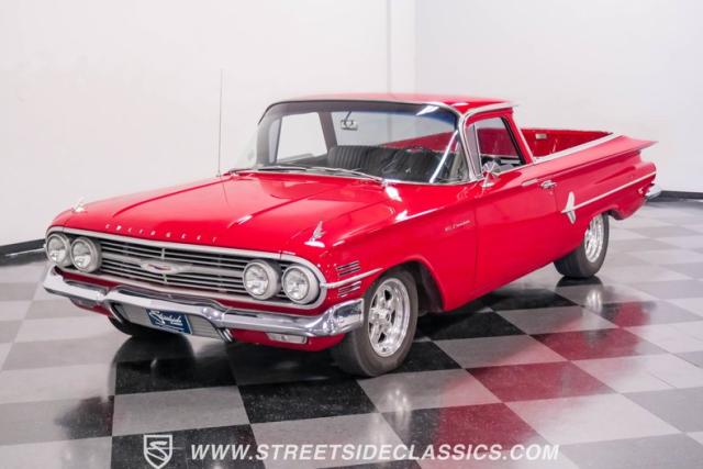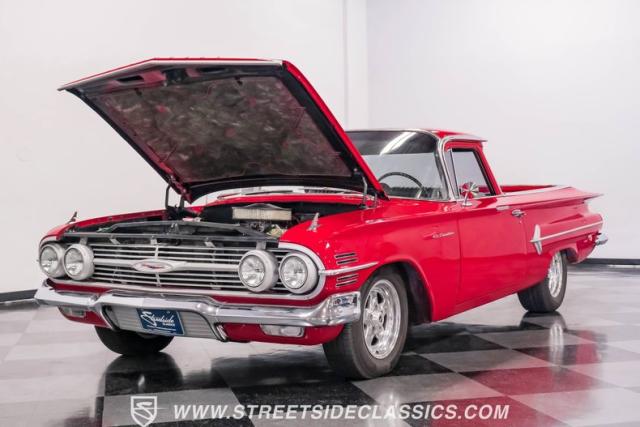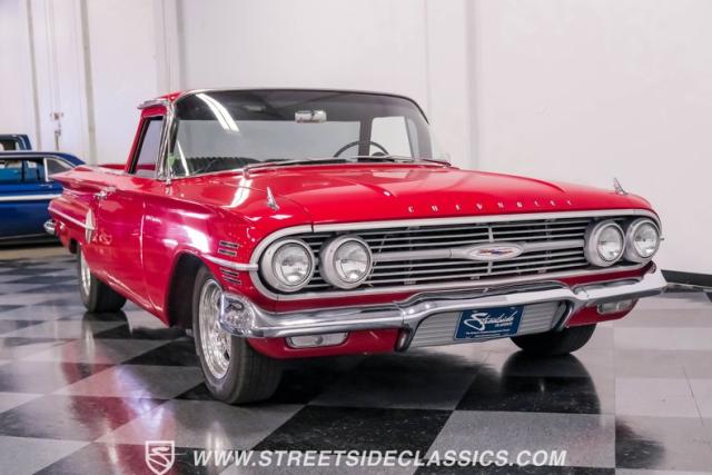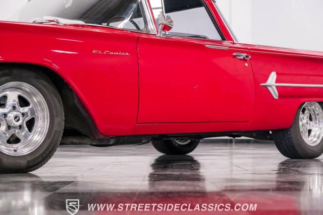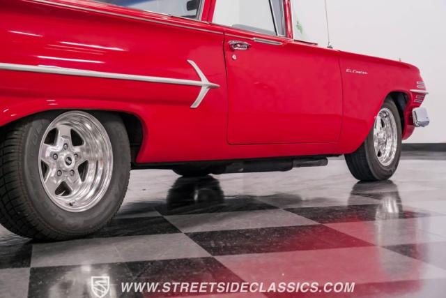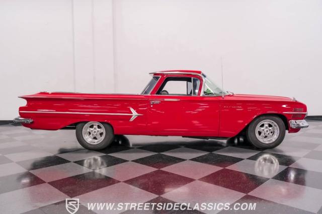 This 1960 Chevrolet El Camino showcases a bold Roman Red finish that emphasizes its unique silhouette. The wraparound rear glass, sporty roof overhang, and tailgate with integrated tailfin create a distinctive profile. Gray trim accents provide contrast against the vibrant paintwork. 15\" Summit Racing wheels fill the wheel wells, with 205/70R15 General tires up front and 225/60R15 Cooper tires in the rear. Chrome trim accentuates the El Camino\'s lines, while the bed maintains a clean, barely-used appearance. This model represents just 1% of Chevrolet\'s total production on this platform for 1960, making it a scarce find for collectors.