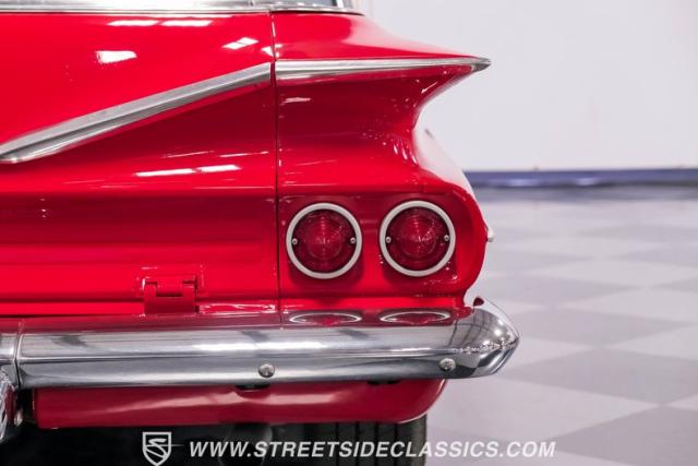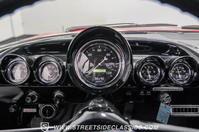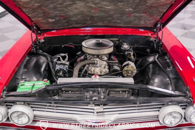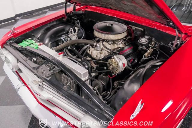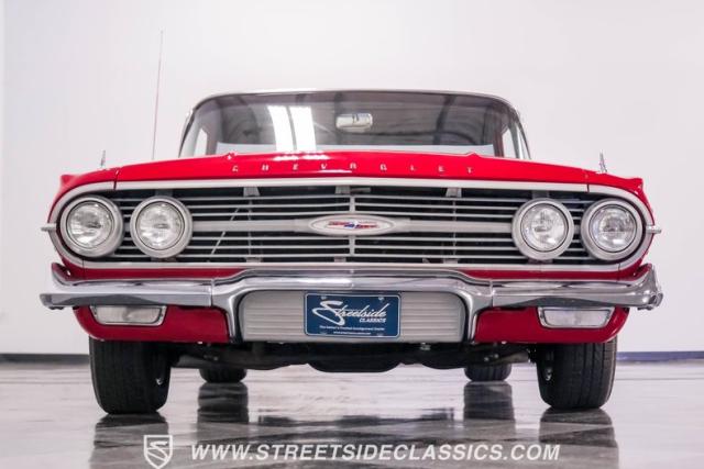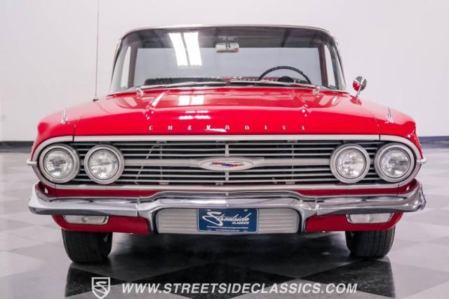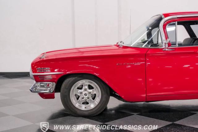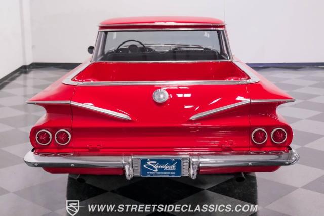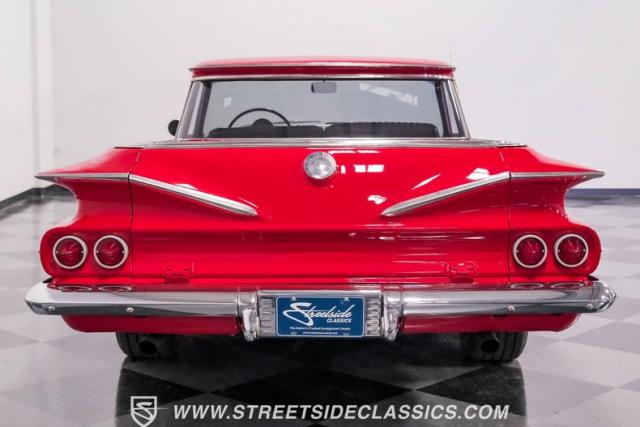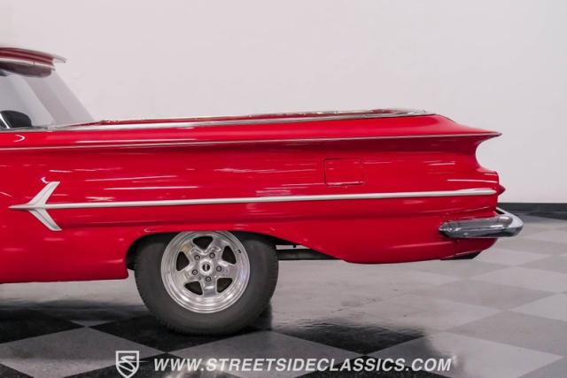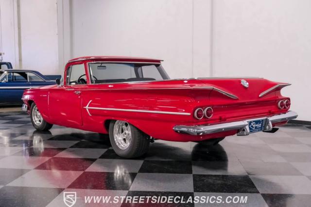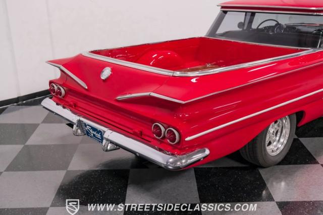This 1960 Chevrolet El Camino showcases a bold Roman Red finish that emphasizes its unique silhouette. The wraparound rear glass, sporty roof overhang, and tailgate with integrated tailfin create a distinctive profile. Gray trim accents provide contrast against the vibrant paintwork. 15\" Summit Racing wheels fill the wheel wells, with 205/70R15 General tires up front and 225/60R15 Cooper tires in the rear. Chrome trim accentuates the El Camino\'s lines, while the bed maintains a clean, barely-used appearance. This model represents just 1% of Chevrolet\'s total production on this platform for 1960, making it a scarce find for collectors.