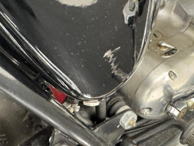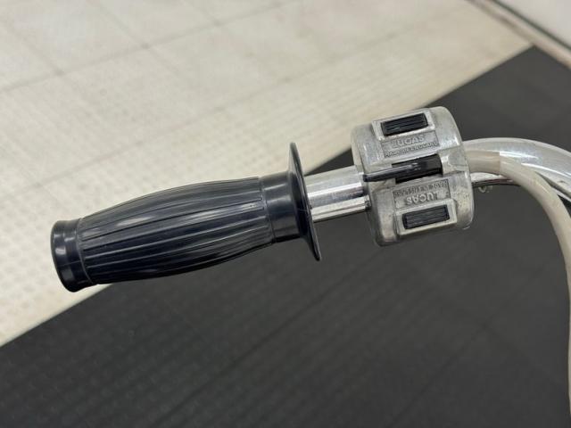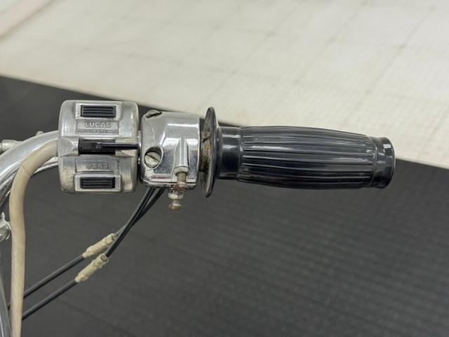 Hard rubber grips enjoy the presence of nearby Lucas thumb controls, and each shows a bit of patina. Indicator lights are embedded in the headlight housing just ahead of the tachometer and speedometer, both cleanly designed and easy to read. The gas cap is offset to the right on the tank and fixed foot pegs are down below for a single rider.