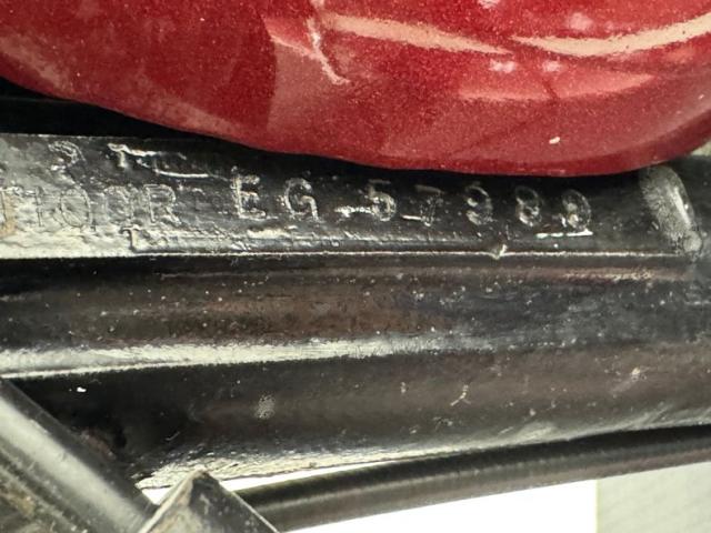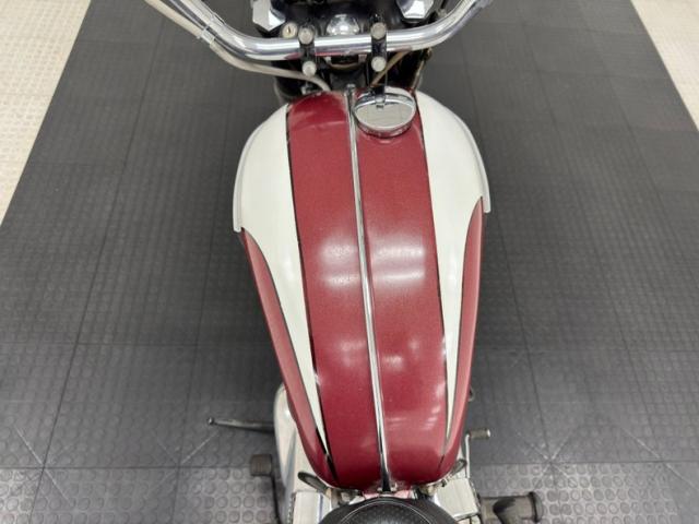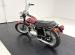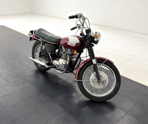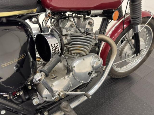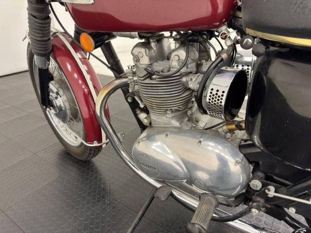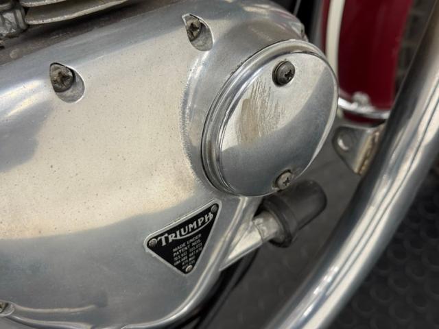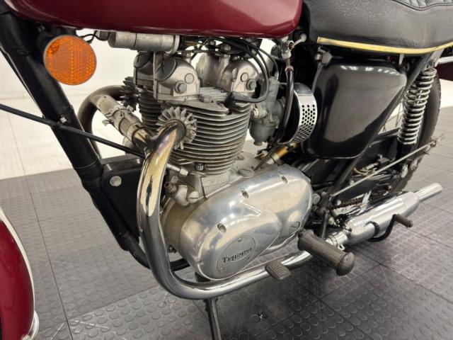 Painted components here are Cherry Red accented by white stripes on the fenders and on the tank, characteristic streaking scallops begin at the Triumph emblem and come to a point at the seat. The single stage paint is in very nice condition as are the tank badges, bordered in chrome. The black vinyl seat has a border as well, this one on the lower edge and this one in gold. Both the headlight and tail light are flanked with marker lights and also reflectors mounted to the side of the bike. Chrome wire wheels, 19-inch front and 18-inch rear, are accompanied by other chrome goodies including the dual exhaust, rear shock coils, upright handlebars, and of course, the headlight housing.