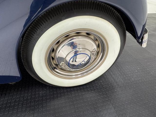 What would have been leather or Bedford cord in the day has been updated with beautiful saddle brown vinyl while retaining original styling that includes stitch patterns on the door and symmetrical stitches on the bench seat. Your mother inlaw or kids will have to settle for less formal seating in the rumble seat but it, like all other surfaces, is in excellent condition. A gray banjo steering wheel fronts a taupe colored dash with ivory knobs and off white gauges and it\'s all clean. Accessories include a fan and an added temperature gauge under the dash while a candy cane colored handle tops the shifter, rising from the rubber coated floor. Chrome and wooden framing of the convertible mixes with beige material and glass window for a clean finish to this American classic.