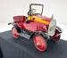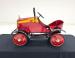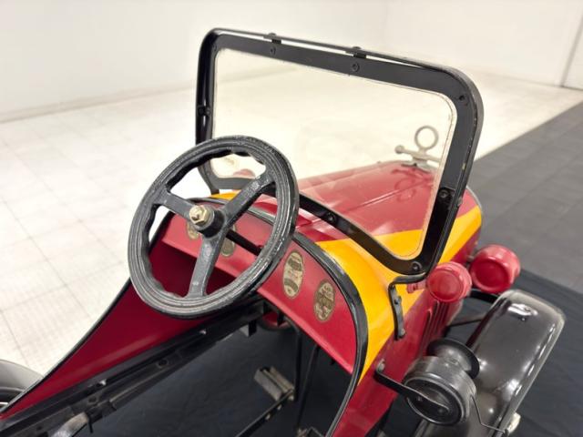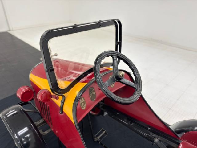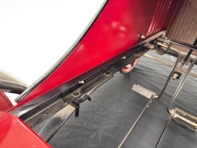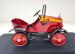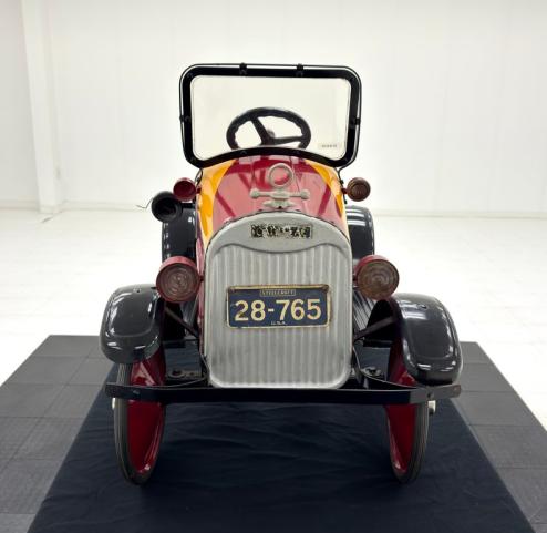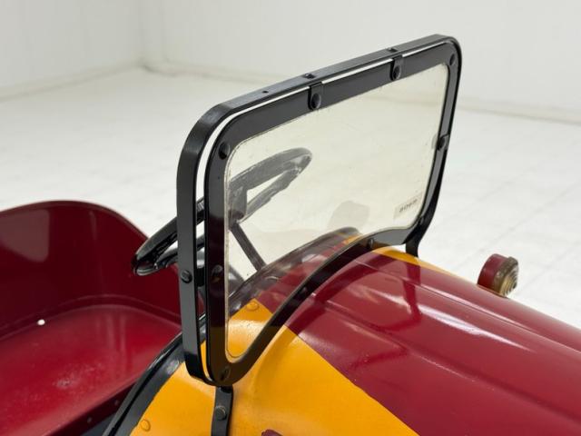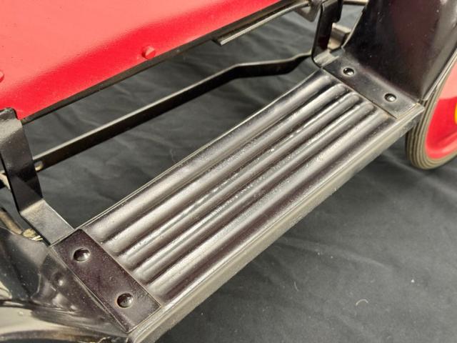 The maroon body is enhanced by a yellow stripe that flows rearward, expanding as it travels to the cabin, and picked up by the pinstripe on the wheels. Just behind the tin can headlights are louvers, just as you would find on a real car to vent engine heat. Just like the real cars of the time, the fenders and connecting running board are painted in contrasting black. Up front, the grille and simulated motometer retain some period patina as the Cadillac label is weathered and worn, the plastic headlights have yellowed, and the Steelcraft license plate shows its age. Other external features include a plexiglass windshield in black frame, an external horn, and polished hubcaps.