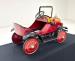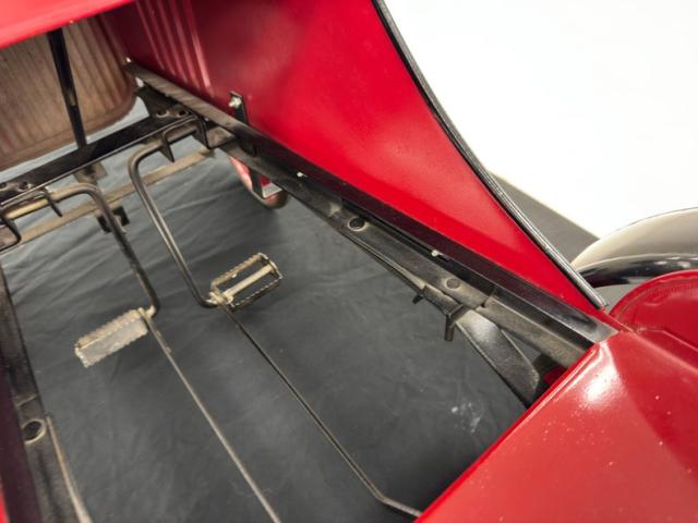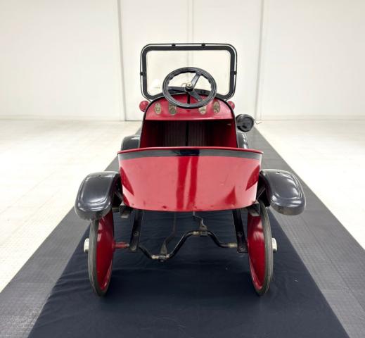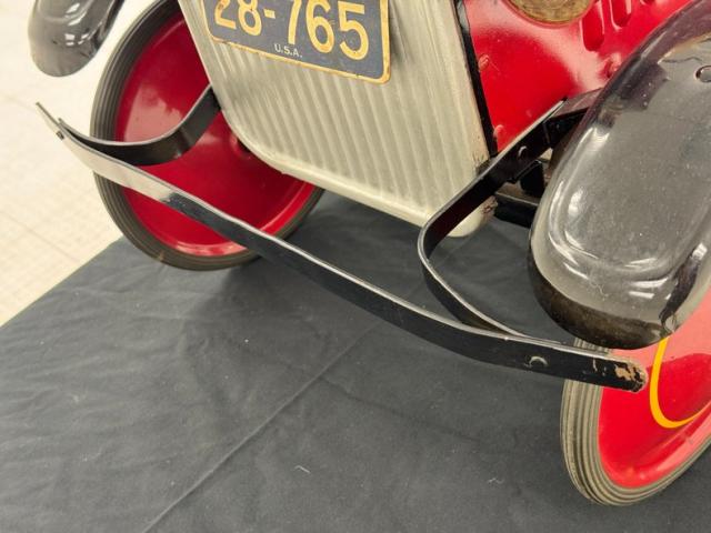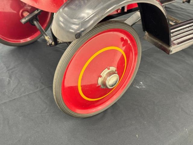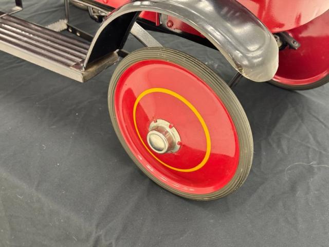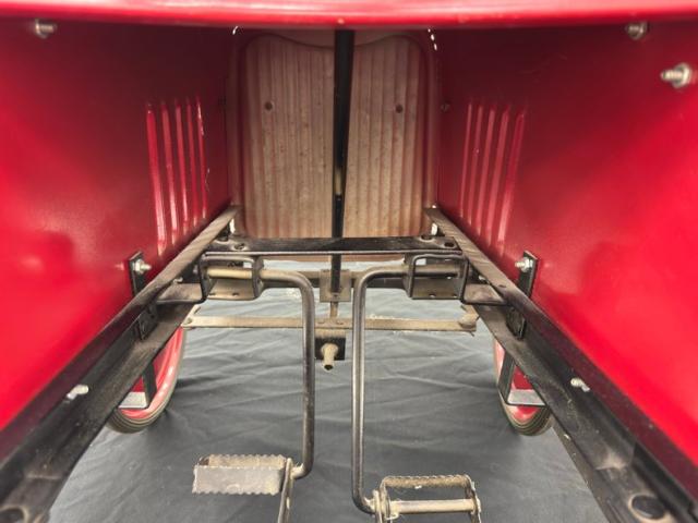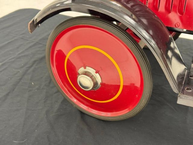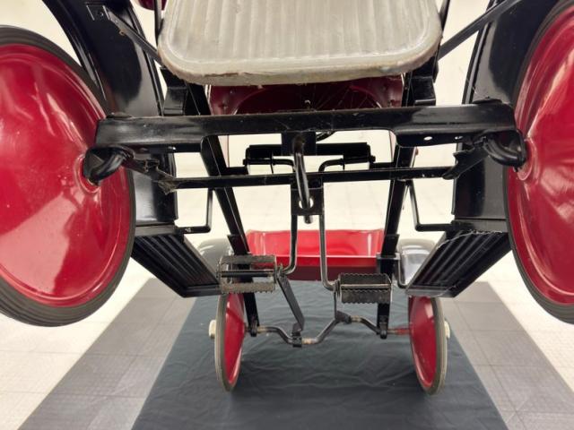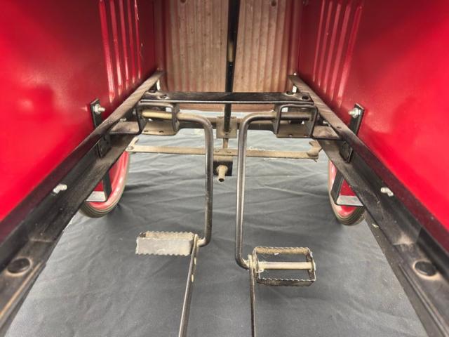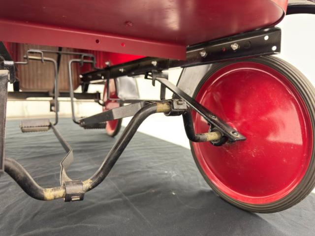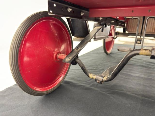 Red disc wheels carry solid, round edged tires in good shape. The pedal linkage and axles show a bit of patina and typical wear on the moving parts, but everything is intact. No rust is noted.