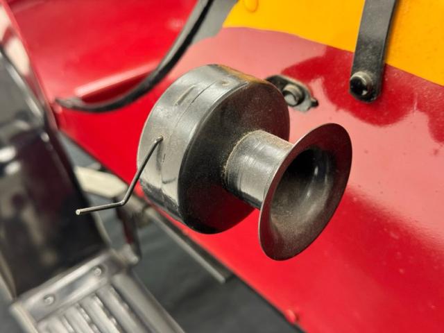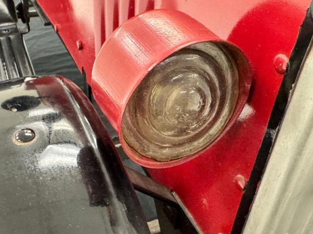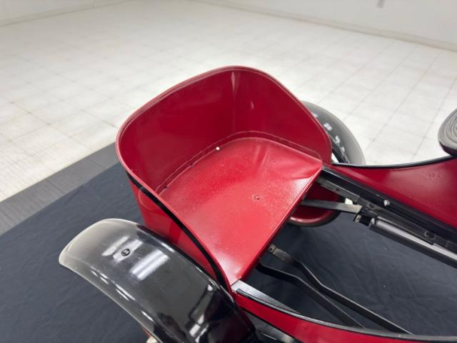 The steel seat enjoys a rounded upper and the driver is provided with a triple spoke black steering wheel and series of vintage gauge decals on the dash panel. Down below, the steel pedals are connected to black painted rails and levers and everything is intact.