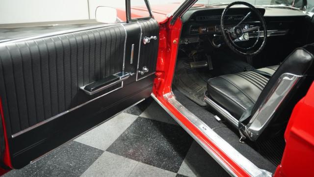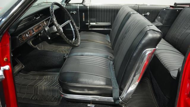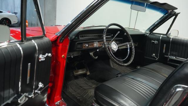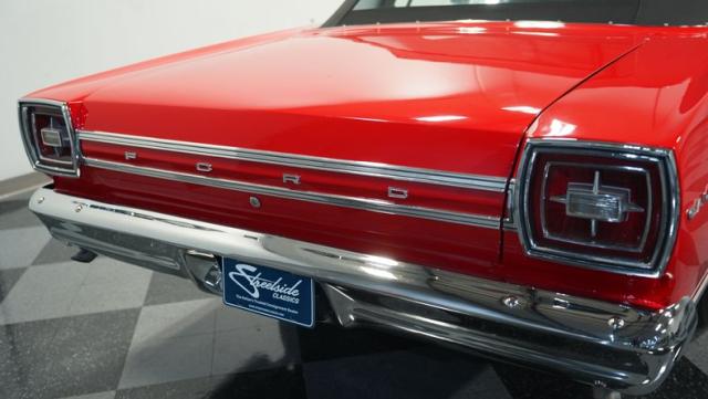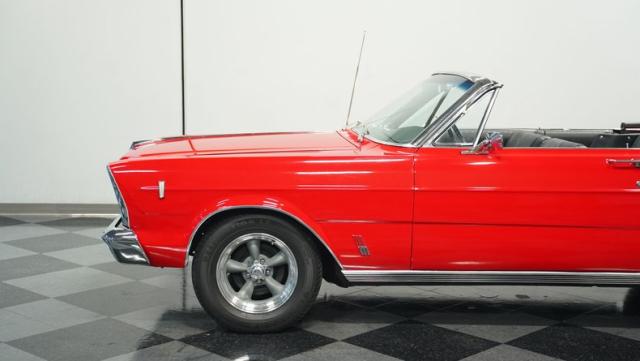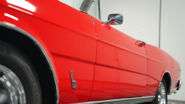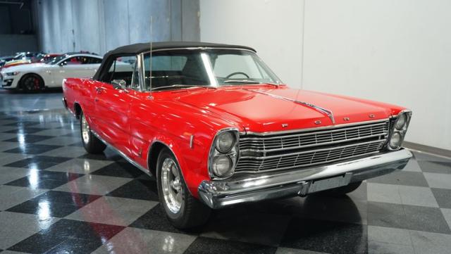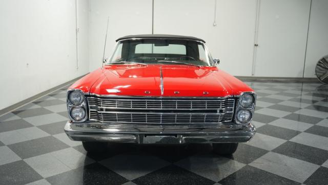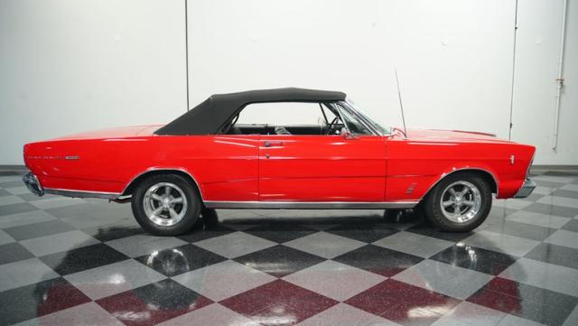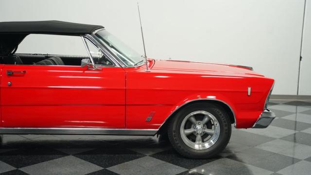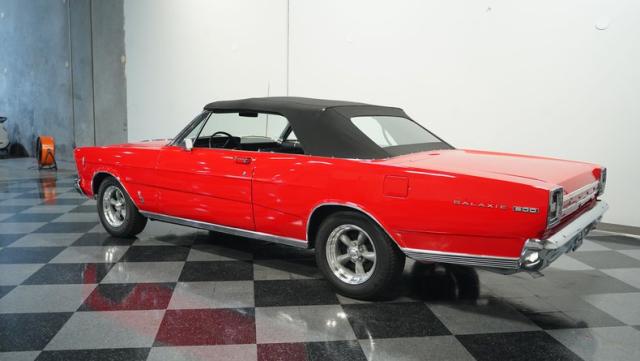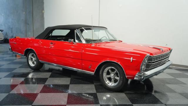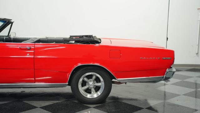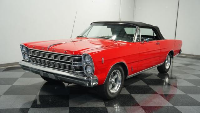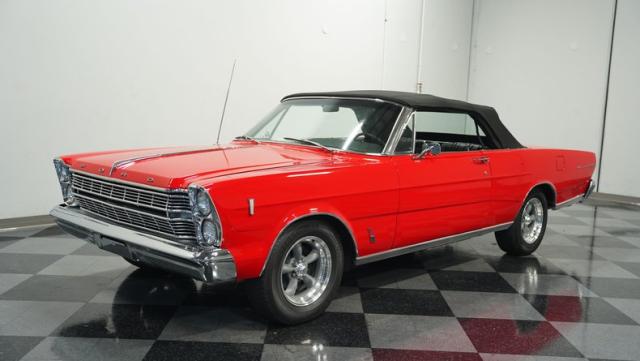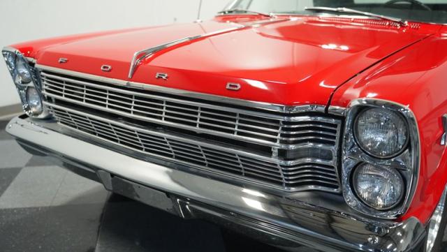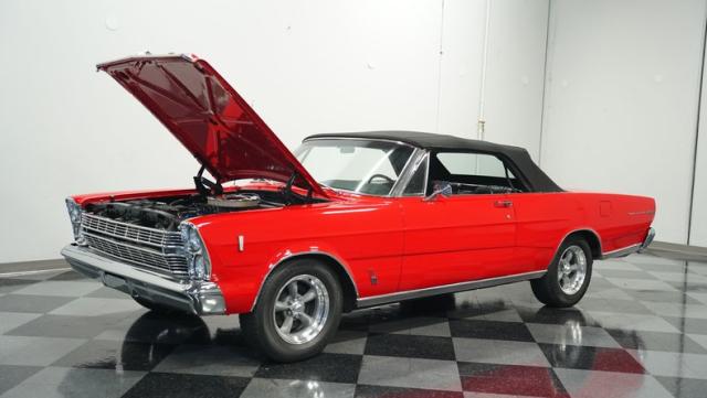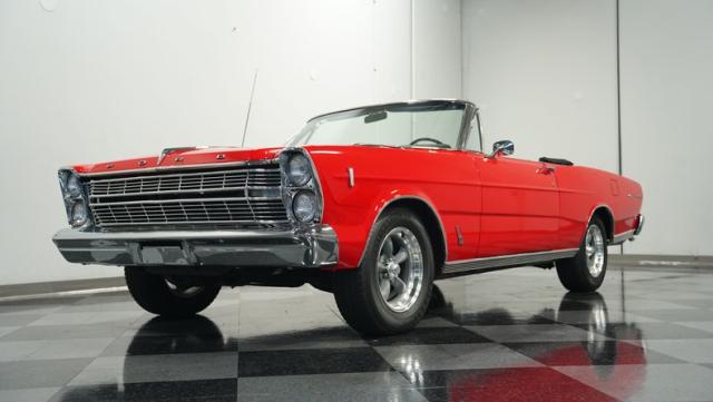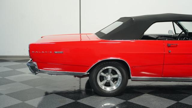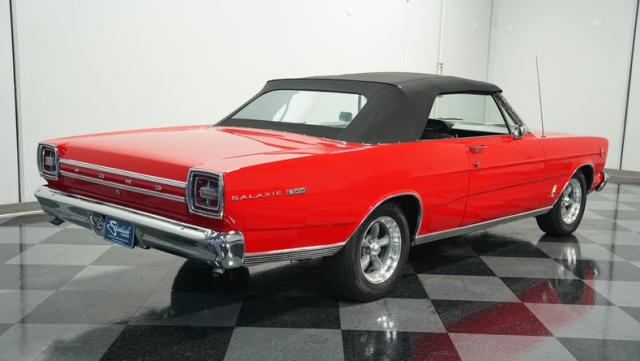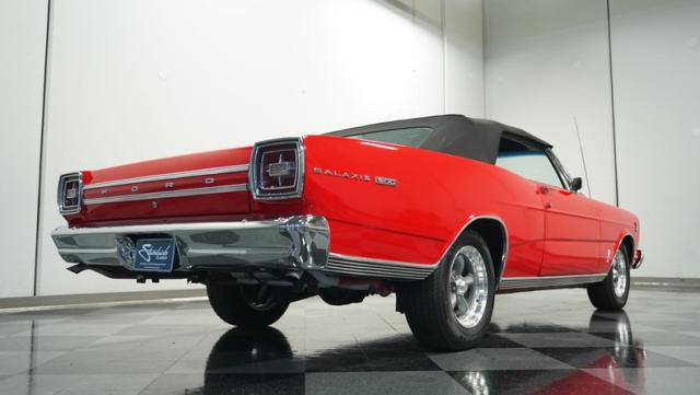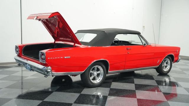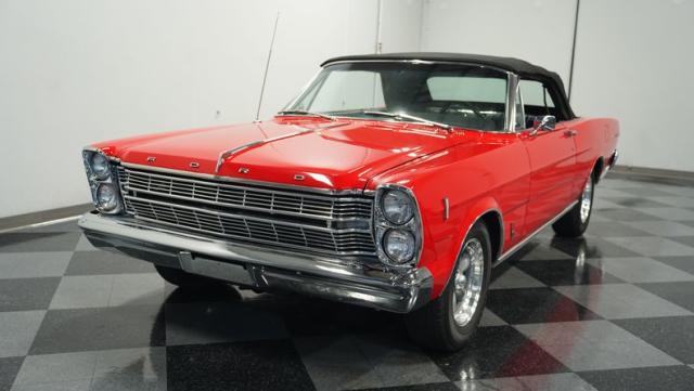 This 1966 Ford Galaxie 500 Convertible has been in the same family for over 40 years. The Candy Apple Red finish, applied 3-4 years ago, accentuates its classic lines. 16\" American Racing wheels and 235/65R16 tires give it a purposeful stance. A black cloth convertible top with a glass rear window offers versatile driving options. Sheet metal work, particularly on the driver\'s rear quarter, maintains the car\'s original profile.