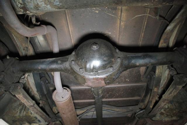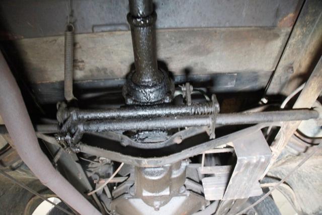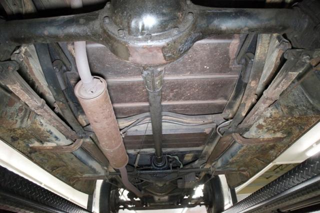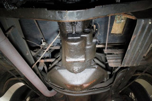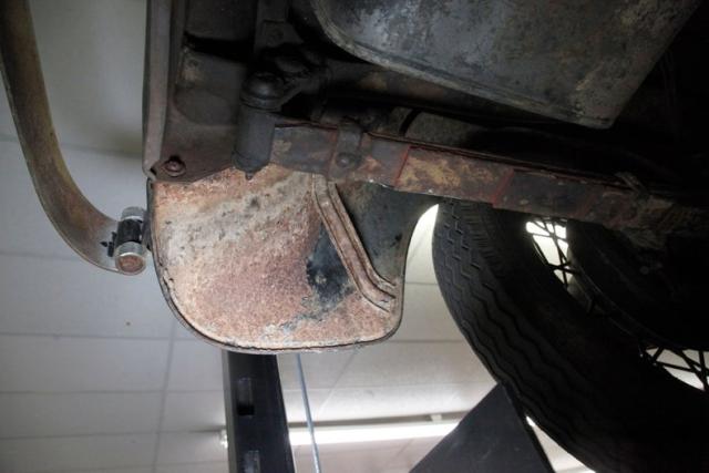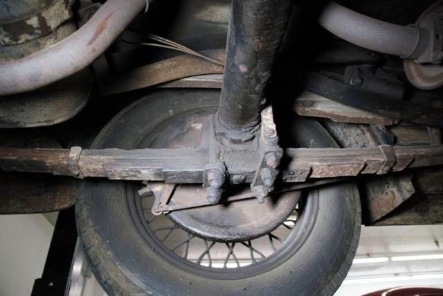 Surface rust and plenty of patina on X frame, and body hangers, but no invasive rust is seen underneath. The wood flooring remains intact,as do the surface rusted bottoms of the running boards. Road dirt is present on most of the suspension parts which include a leaf spring arrangement front and rear. Mechanical drum brakes on all 4 corners.