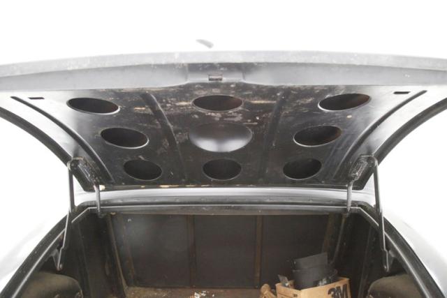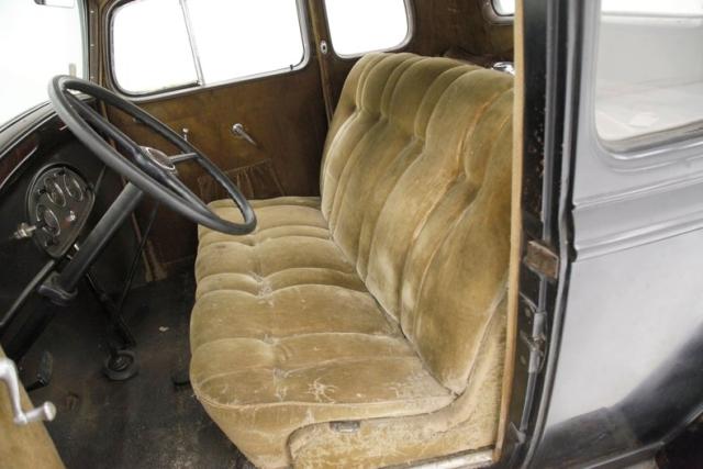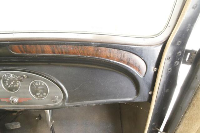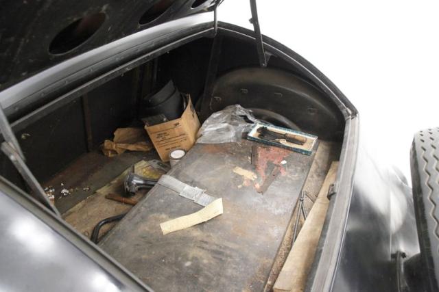 Worn and quite possibly the original tan mohair broadcloth covers all the interior, including the door panels and the buttoned and wide tuck and roll paneled overstuffed interior bench. Black rubber matting provides the sea of flooring for the beach to float on. There is mothdamage, light tearing and general wear seen on the bench. A nice big round black steering wheel is fronting the all black painted steel dash front. Within this dash are dual crescent shaped wood veneer panels and dash central holds the factory instrument cluster within a ribbed and chromed panel. A long shifter and handbrake are on the floor in the center just in front of the bench. A shout to the trunk which is rust free and fairly clean in all steel configuration. Plenty of room for the Tommy guns and hooch!