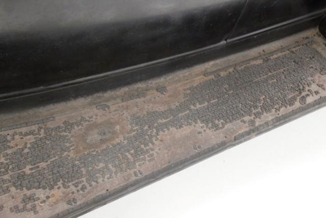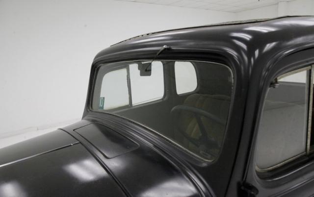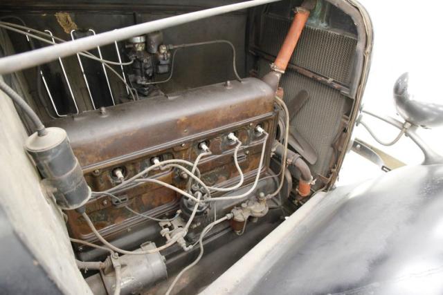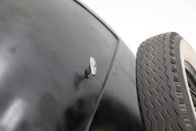 Leading the way is the egg crate filled and chrome corral grilleup front and the single chrome bezel and cased headlight on either side to light your way. The horn hangs below the driver\'s headlight and moving downward gives us a view of the simple curved chrome bumper to frame the lower of the car\'s curvaceous front fenders, which are bathed black. A nice long cowled hood has some accenting horizontal ribs on either side vents, and it hooks up with the passenger compartment at the firewall. More black bathes this body and overall some light fading of the finish, lacquer cracks and an overall patina that comes from age. The central panel of the roof is heavily aged vinyl in black, as the technology of the day did not have the machining capabilities to press a full steel roof. The rounded cabin melts into the curved downward trunk line and frames the single doors and snazzy D shaped rear B pillar glass is seen behind the back of the main crank down window. The glass remains all original with the exception of the right corner glass which is easily notable due to a differing tint. Below the single doors is a running board in black and covered with rubber that is aged, cracked and missing in areas. This board gently curves into the rear fender which undulates with the rear of the car. The back of the car melts into a black painted rear roll pan, and has an exterior mounted spare tire in the back of a curve to match the tire space, rear bumper. 18-inch black wire wheels are wrapped with heavily dry rotted white wall rubber, and a central chrome moon cap is on all wheels including the spare in back.
