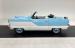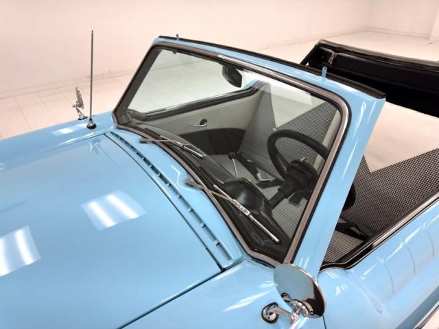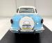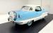 Fifties styling in miniature, the Nash wears a two tone coat of Sky Blue over Snowberry White and the colors are delineated with stainless trim that descends diagonally on the door to expand the blue over the rear quarter. A white canvas top hovers over the car with some of the typical graying, but fully intact. The slight bugeye face with diminutive grille and wrap around bumper adds to the Nash\'s cute demeanor and in profile, the short wheelbase on 13-inch wheels is consistent with the brand\'s reputation \"as fun to look at as it is to drive\". Out back, a more formal addition is the inclusion of a Continental type rear mounted spare, this one with a chrome rimmed white case and flanked by small, oval tail lights. Squeezing 50\'s style into a subcompact car results in a boxy little 149-inch car and this one presents very well. Imperfections include some touched up paint chips and scratches.