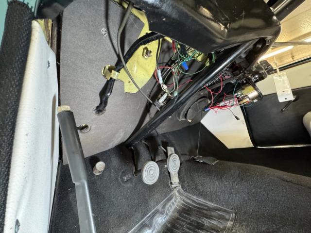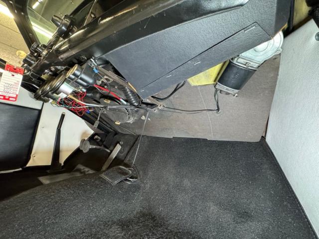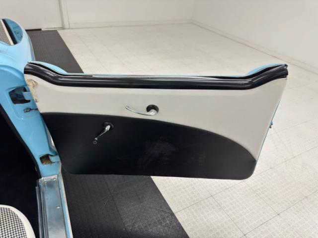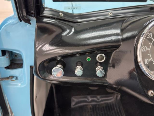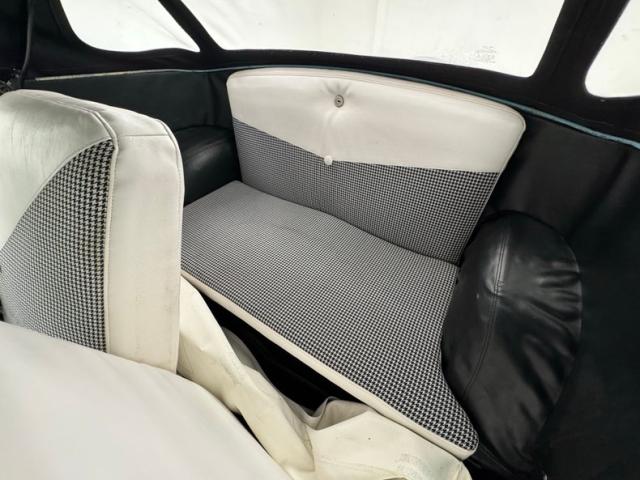 The two tone palette continues on the interior where vinyl door panels present smooth white uppers over black lowers, both presenting cleanly. The split bench artfully puts the angular white design on top as houndstooth cascades down meeting the lower bench which is wrapped in a white vinyl base. The small rear bench shares in the design and clean conditions with the vinyl covered inner fender wells serving as armrests. The simple dash begins with a sporty three spoke steering wheel framing a single gauge, the speedometer, in the center. Knobs, small horizontal gauges, and an AM radio fill the rest of the panel which is satin black in color and provides a storage shelf in lieu of a glove box. A triple gauge package has been added to monitor oil, water, and volts and it maintains the black and white palette, as does the black carpet and white vinyl that lines the footwells. Two 12 volt outlets have also been added to the dash.