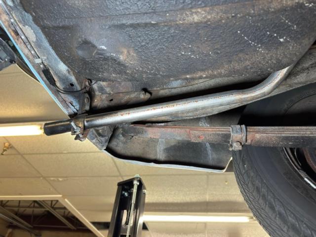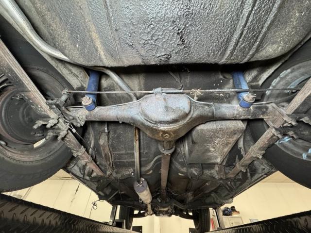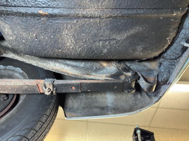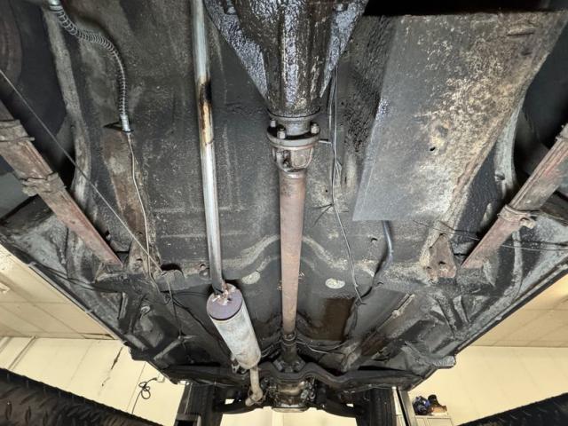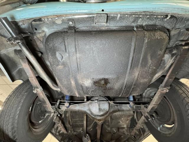 Driver quality conditions prevail underneath with some typical surface rust, drops of oil, oil sling, and some build up. There are areas of flaking invasive rust, areas of spray foam and some areas which were repaired while other parts encapsulated. Drum brakes are found at all four wheels and the single exhaust travels through a stock style muffler on its way to the back. Suspension consists of coil springs up front and leaf springs in the rear.