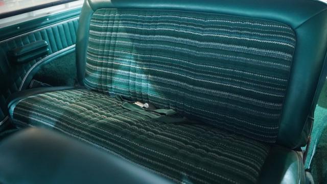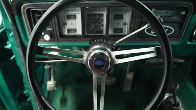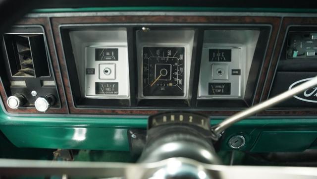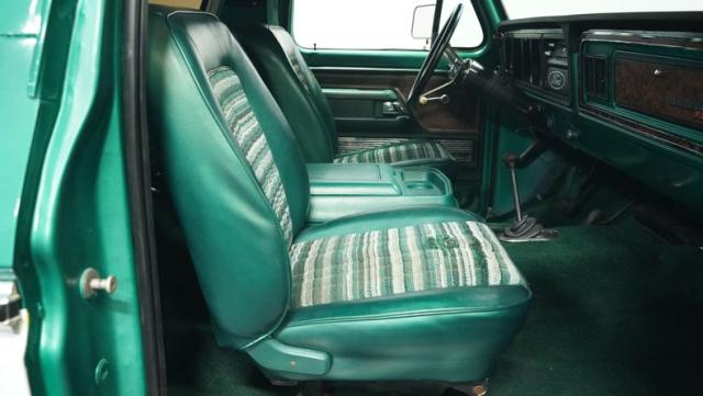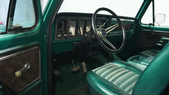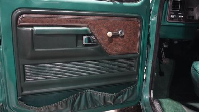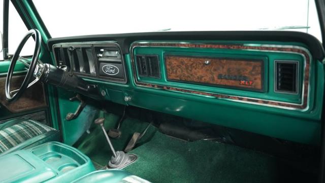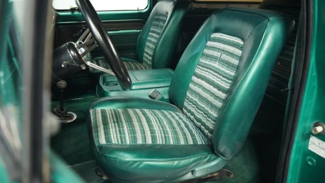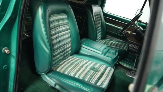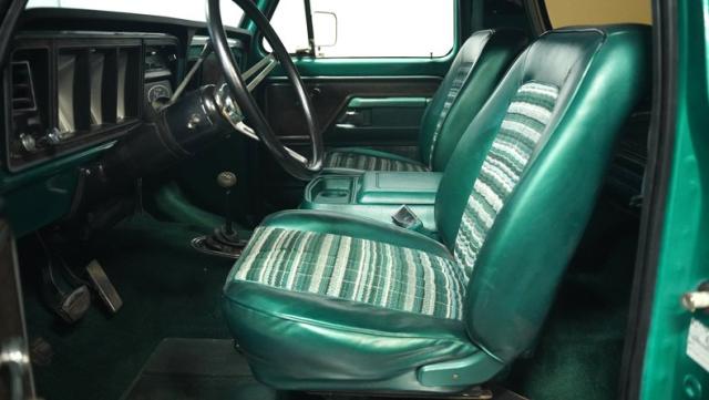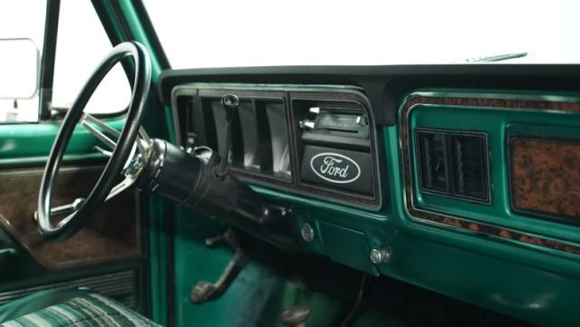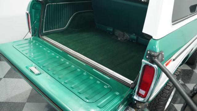 Inside, the Bronco\'s cabin showcases a blend of comfort and utility. The plaid vinyl and cloth bucket seats, set against a green backdrop, offer a nostalgic nod to the \'70s. A center console adds convenience, while the column-shifted automatic transmission keeps the floor clear for off-road adventures. The completely stripped and repainted interior gives this classic a fresh feel, with door panels and headliner in good condition. Air conditioning is absent, allowing for a more authentic open-air experience when the top comes off.