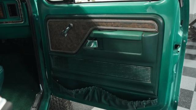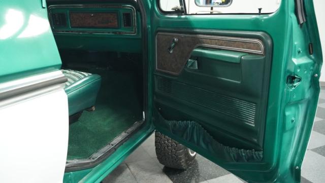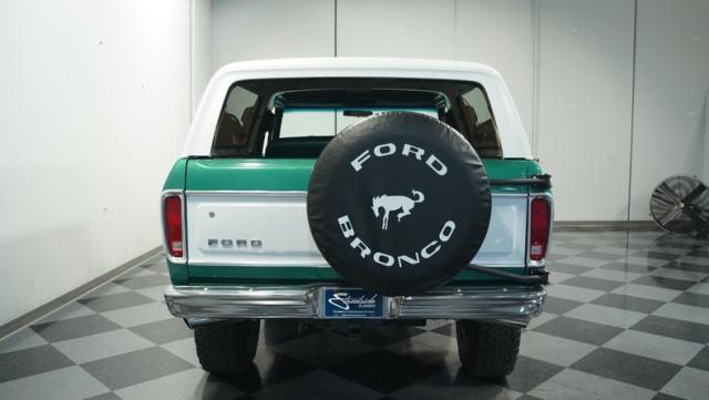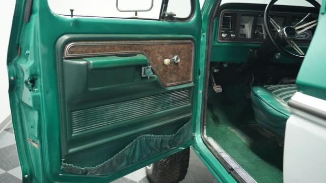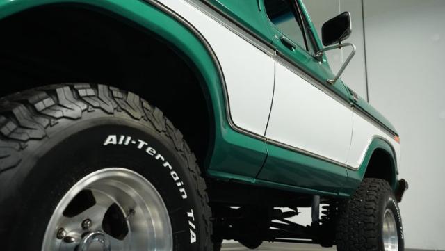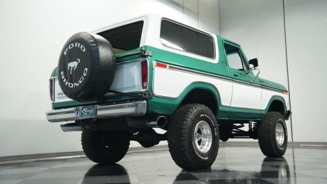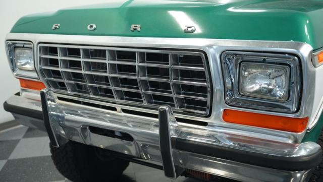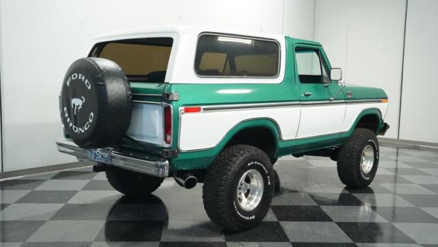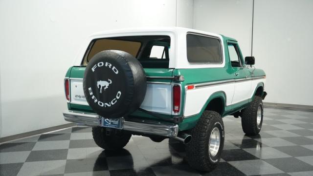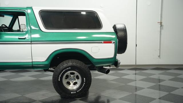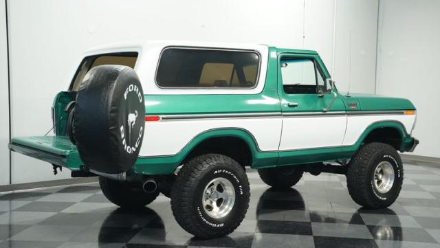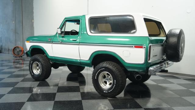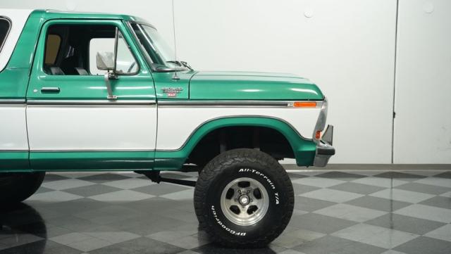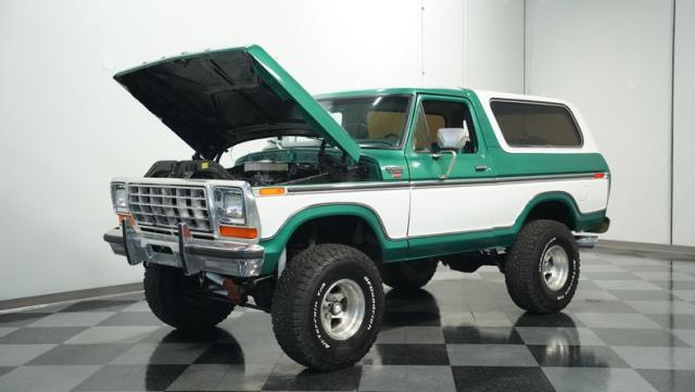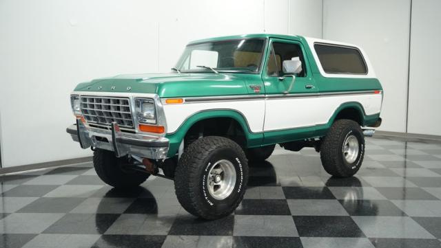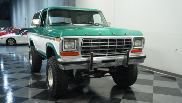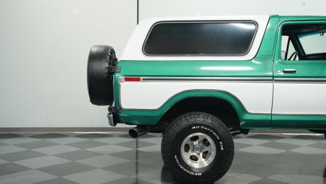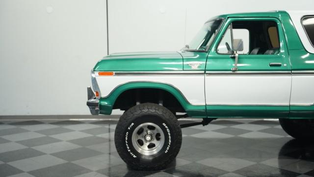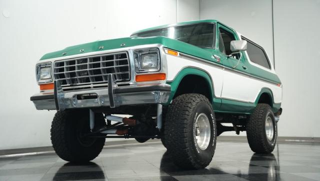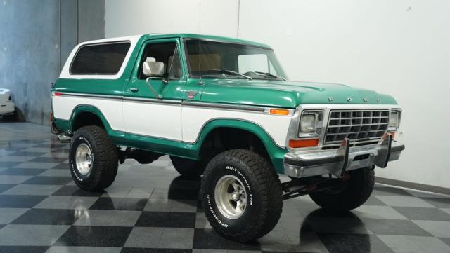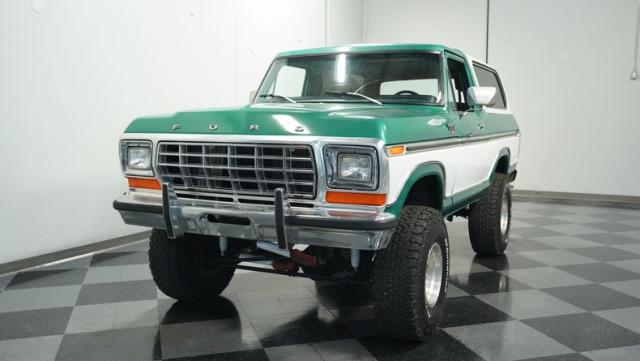 This 1979 Ford Bronco XLT 4X4 towers over the competition with its commanding 6-inch lift. The green and white two-tone paint, applied just a few years ago, gives this classic off-roader a fresh, rugged look. Riding on 15-inch wheels wrapped in beefy 35x12.50R15LT BFGoodrich All-Terrain tires, this Bronco is ready to tackle any terrain. The new windshield and repainted removable top add to its trail-ready appeal, while the stock-spec chrome and brightwork maintain its classic charm.