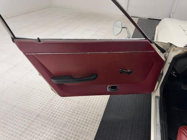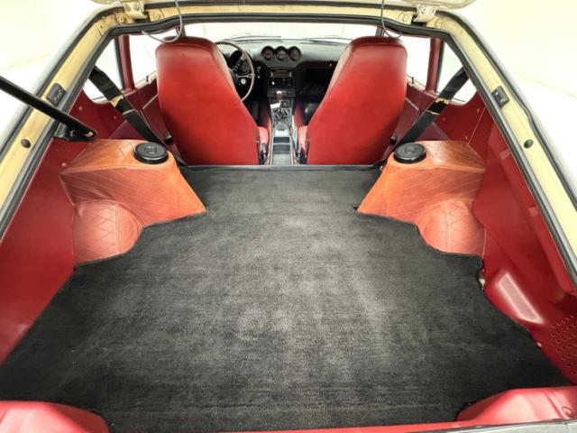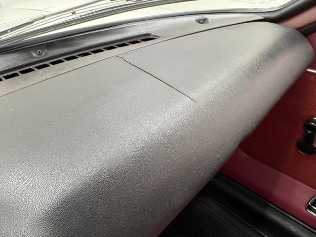 The word original looking crops up with sleek styled high back bucket seats that have new recovered red vinyl tuck and roll inserts and smooth red bolsters. Small round air venting is seen on the bucket lowersof the uprights. A black plastic deep inset instrument molded dash is original and shows with 3 small cracks. There is a factory wood rimmed steering wheel, inset round sweep gauges are in the front of the driver, and within top of center dash is a trio of deep inset round gauges. Just below is an AC vent, temp sliders, and factory AM/FM radio. This panel melts into the center console where the shifter and handbrake reside along withan open tray storage area in the back. The sides of the console covering the hump we note triangulated stitched vinyl in red covering. Behind these seats is a carpeted storage area, ready to hold nearly anything you can throw in. This carpet as well as flooring carpeting is very clean. The remainder of the rear cargo area is covered in a nice black carpet, the headliner is smooth red vinyl and tight, and door panels are smooth and in good condition.