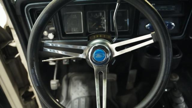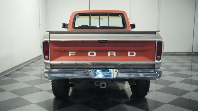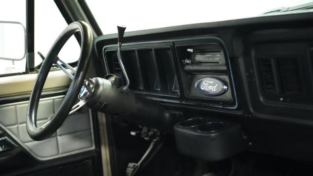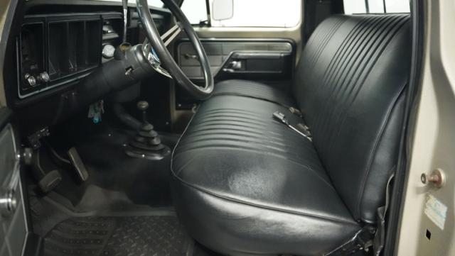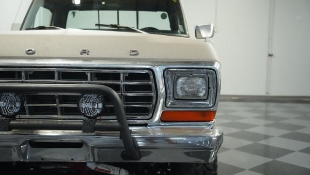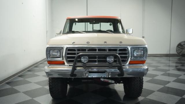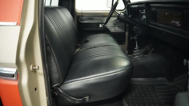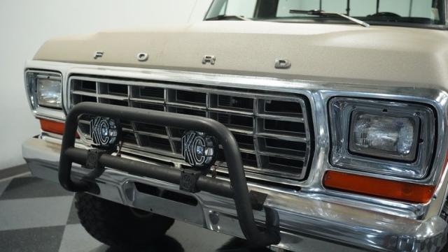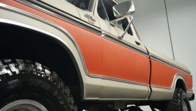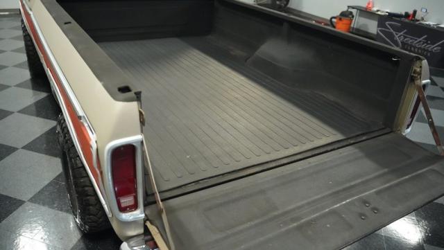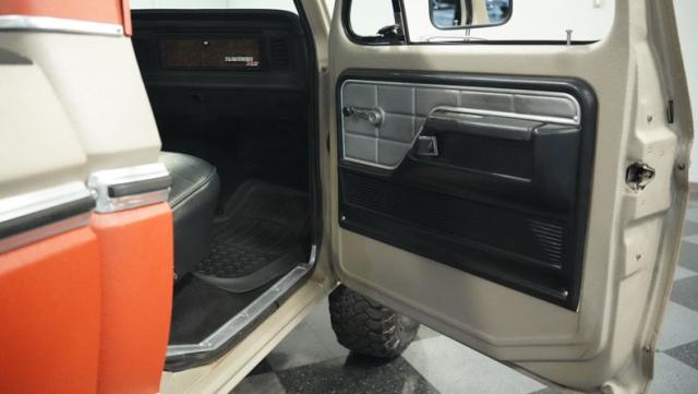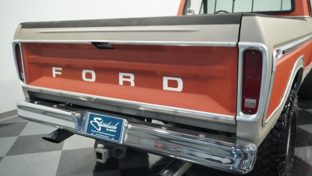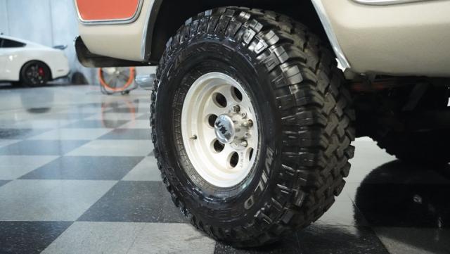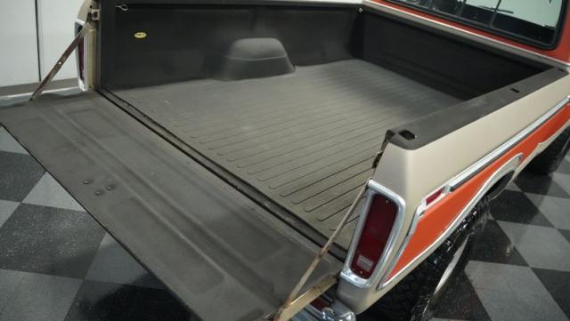 The two-tone Medium Copper and Cream is a correct color package for 1978, and this truck ready for anything with a complete Rhino coated finish. Sitting up on a lift kit with Rancho shocks all around allows the 15-inch M/T alloy wheels wrapped with rugged 35x12.50R15LT Falken Wildpeak M/T tires to look just right on this classic Ford. A push bar fitted with KC driving lights adds to the tough looks in true vintage pickup style.