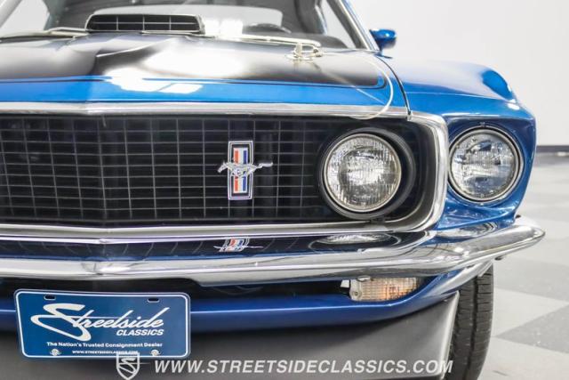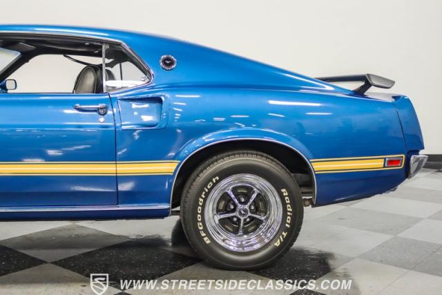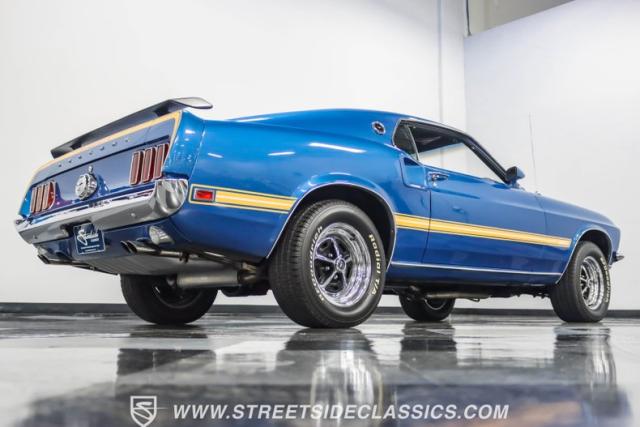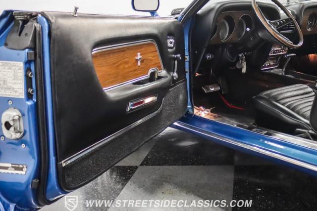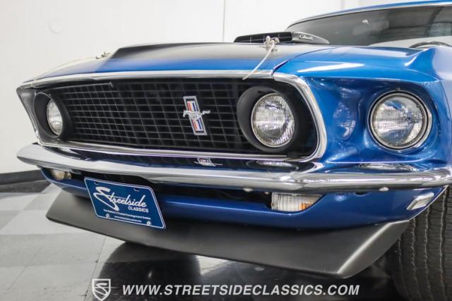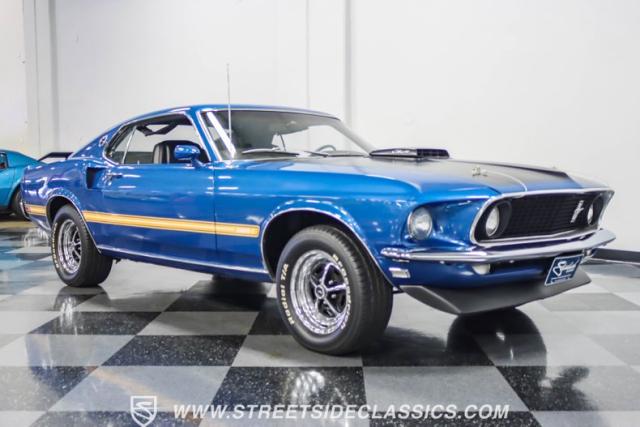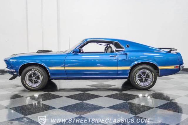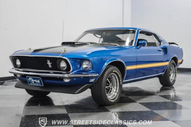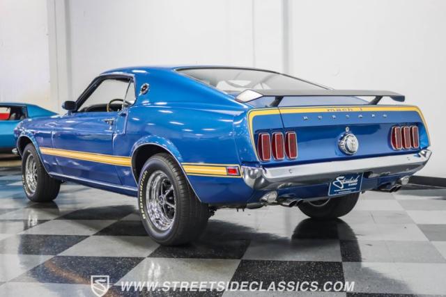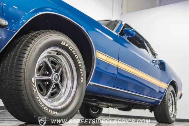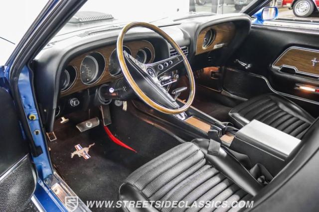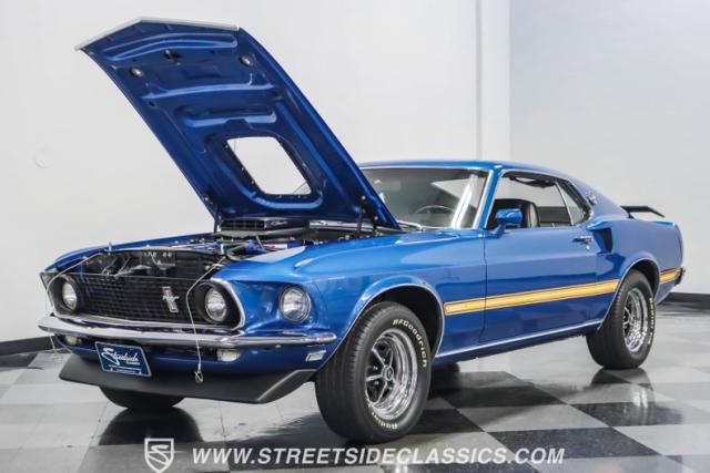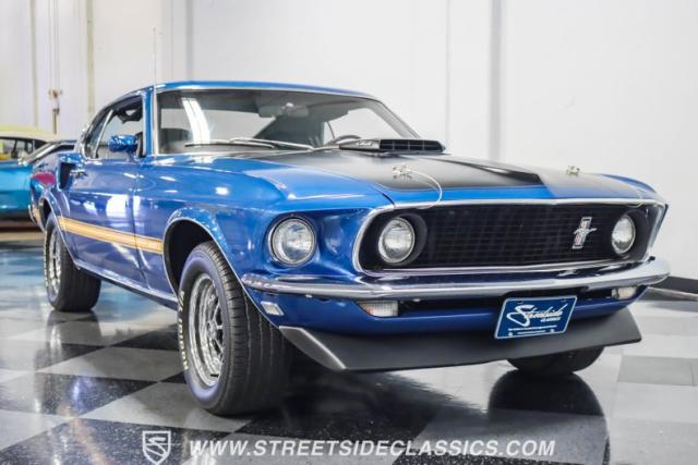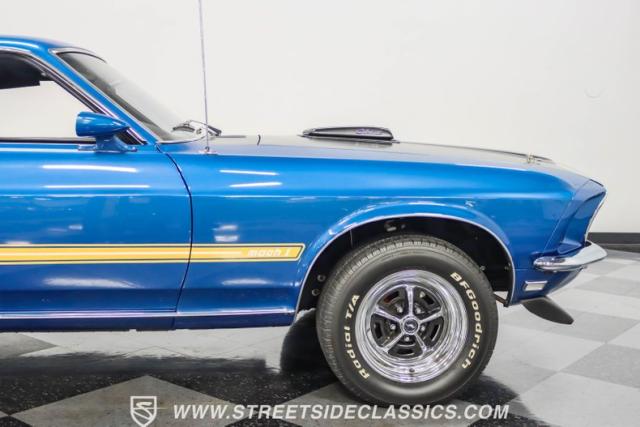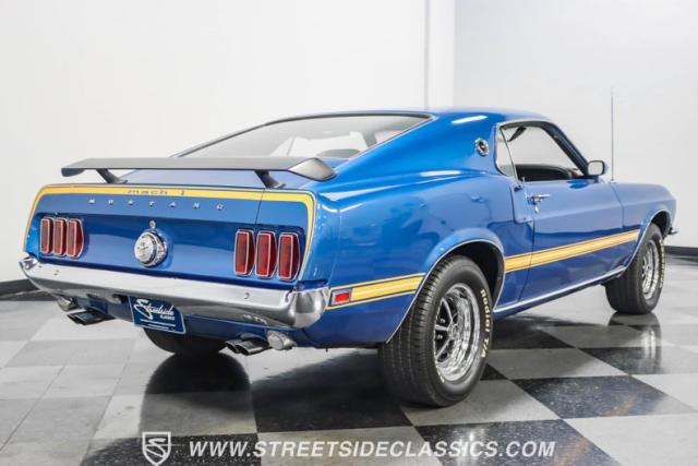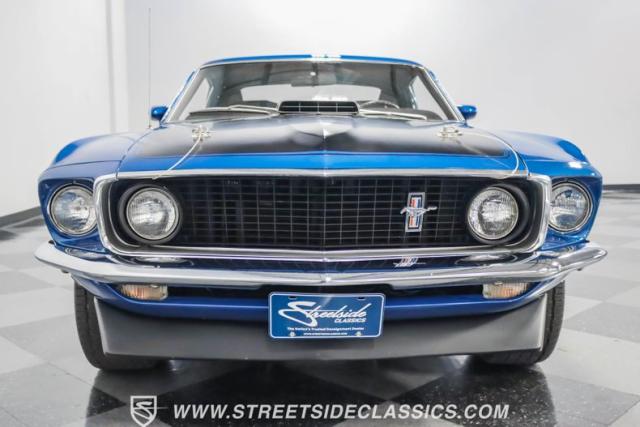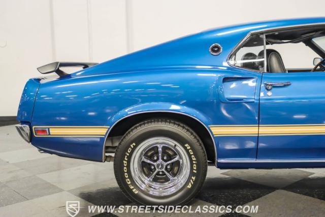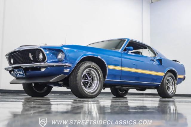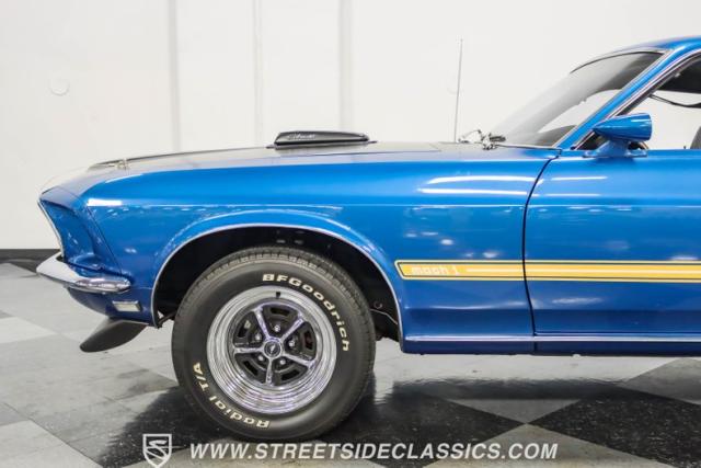 This 1969 Ford Mustang Mach 1 R Code showcases a beautiful color change to eye-catching Acapulco Blue. This Mach 1 exemplifies peak first-generation Mustang performance with an aggressive profile featuring a deep chin spoiler and functional shaker hood scoop, signaling its road-ready capabilities. Riding on 15-inch wheels wrapped in BFGoodrich 235/60R15 tires, this Mustang combines classic aesthetics with modern grip. The black-out hood treatment and fastback design create a muscular silhouette that defines the Mach 1 legacy.