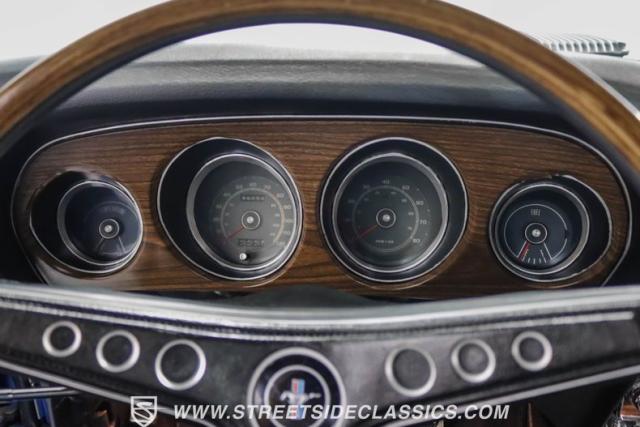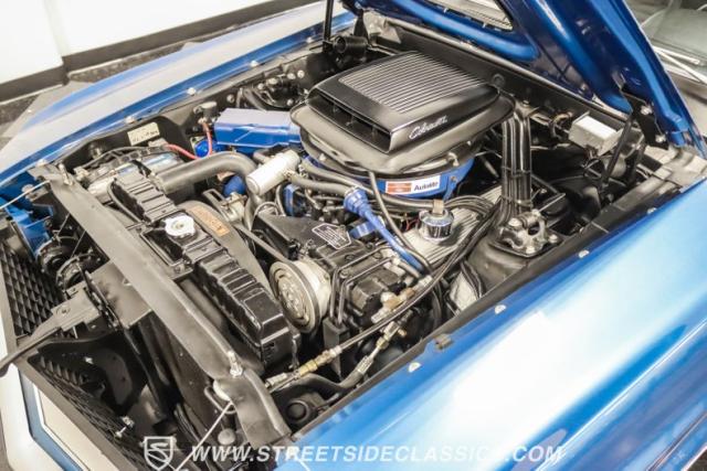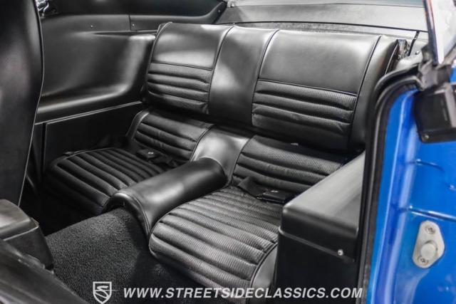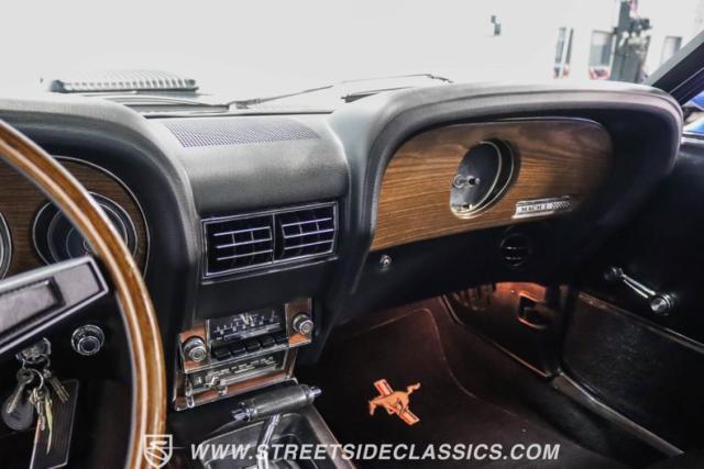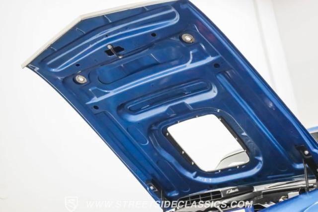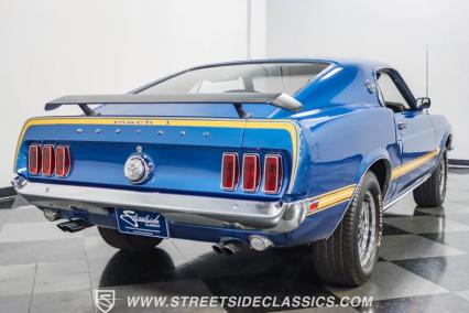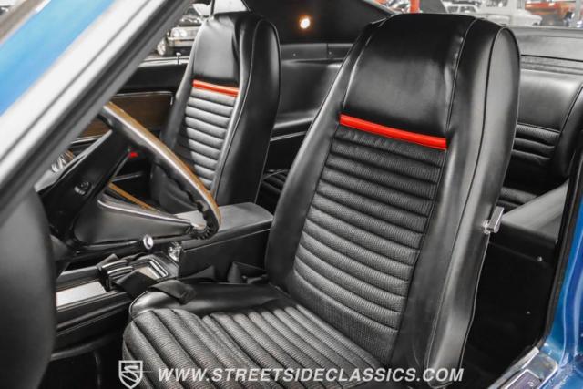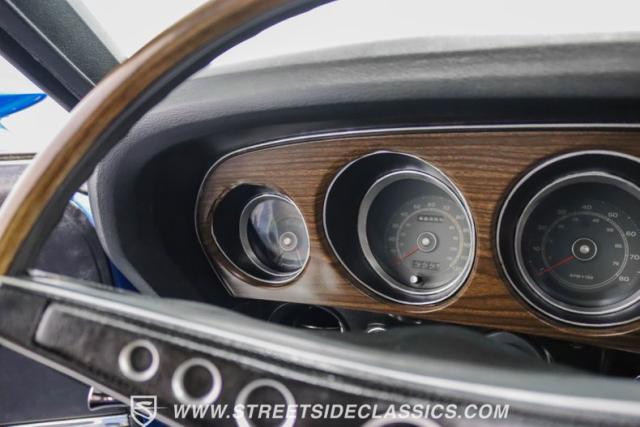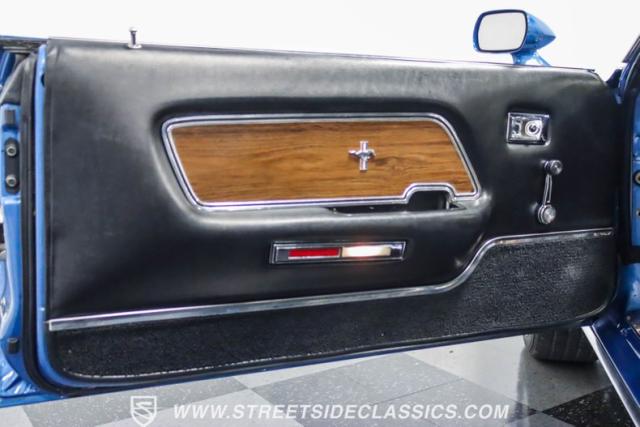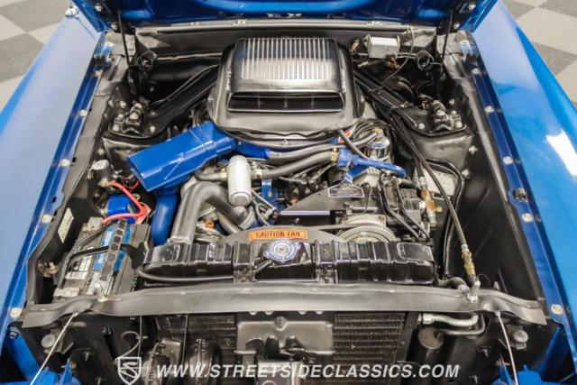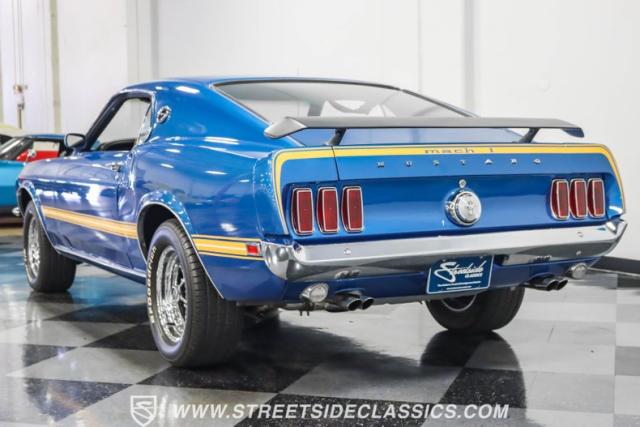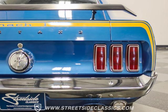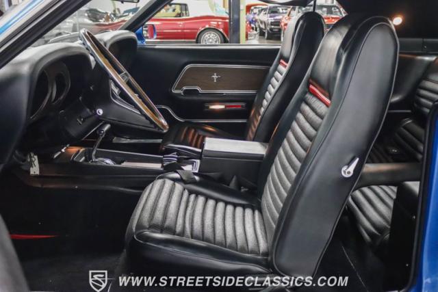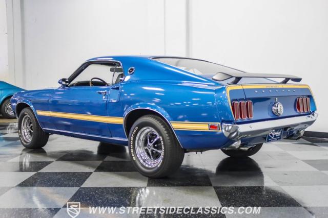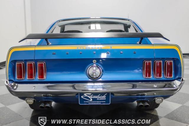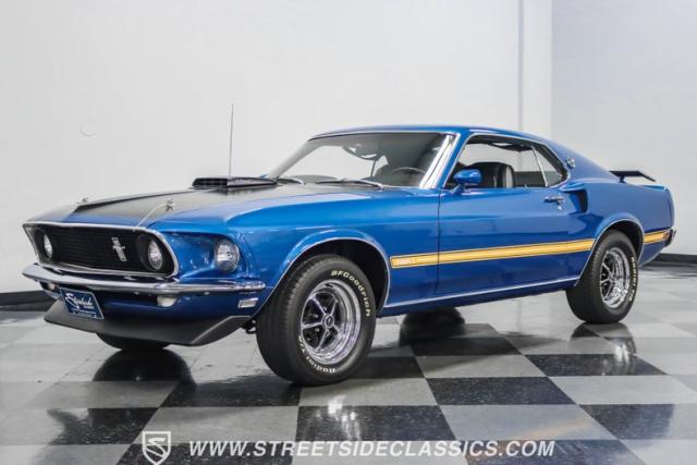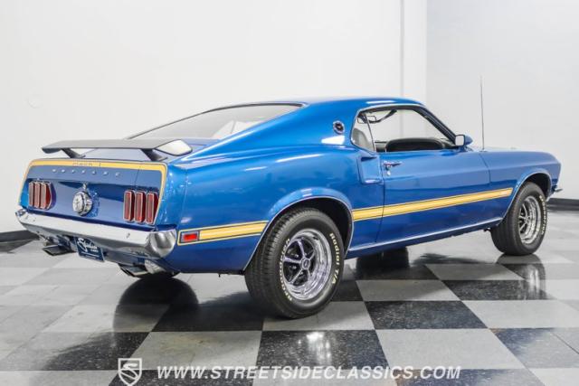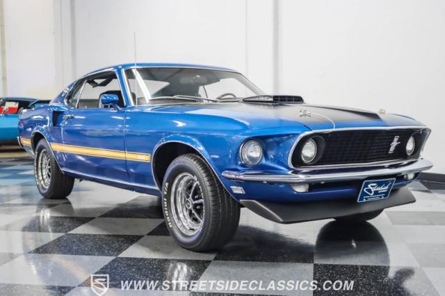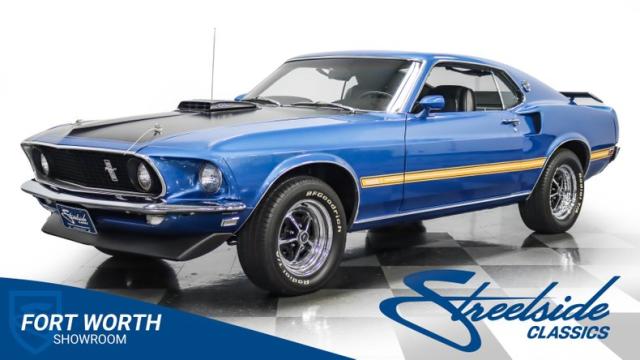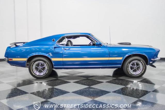 This 1969 Ford Mustang Mach 1 R Code showcases a beautiful color change to eye-catching Acapulco Blue. This Mach 1 exemplifies peak first-generation Mustang performance with an aggressive profile featuring a deep chin spoiler and functional shaker hood scoop, signaling its road-ready capabilities. Riding on 15-inch wheels wrapped in BFGoodrich 235/60R15 tires, this Mustang combines classic aesthetics with modern grip. The black-out hood treatment and fastback design create a muscular silhouette that defines the Mach 1 legacy.