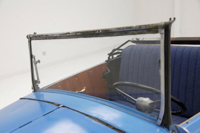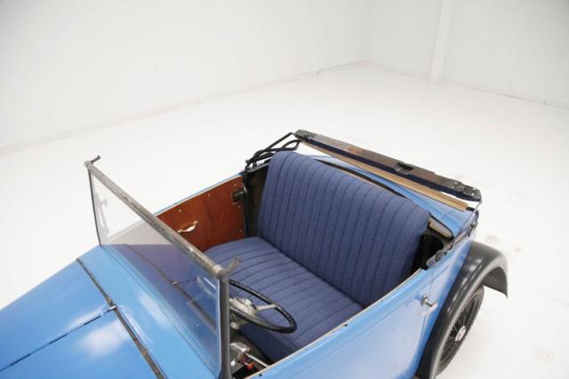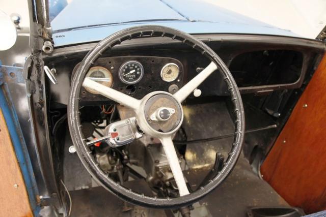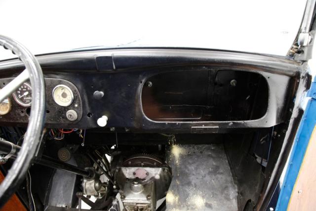 Our left-hand drive version has a redone bench seat in blue tweed with a broad tuck and roll pattern. A tight squeeze for 2 full size plus adults,but that\'s part of the charm of this import. A simple dash cluster within a black oval houses a mix of gauges fromvarious manufactures and sits proudly in front of the driver. This all sits within a black steel dash, missing its glovebox door and sprinkled with a few knobs for some extra charm. An original large steering wheel with an aftermarket horn push button fronts the dash. A long shift lever protrudes from the top of the exposed transmission and is well within reach of the driver\'s left hand. Black wood flooring floats this interior and remains in good condition.