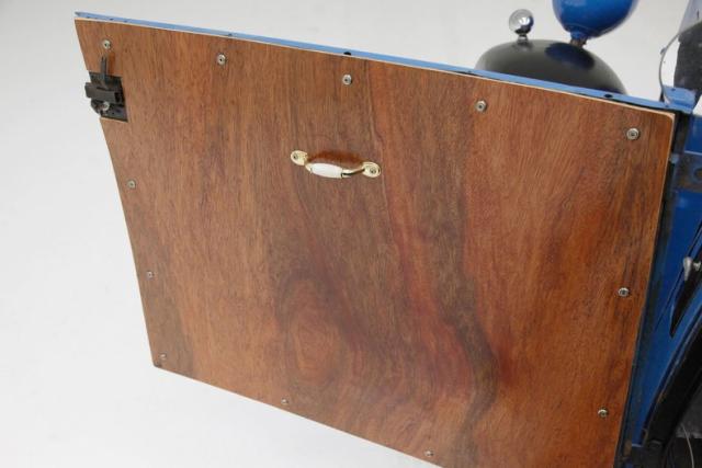 After starting out in the UK upon being built, this Austin eventually made its way to Butler, PA. The steel body is covered in light blue, and panels are straight and mostly dent free. Some faults can be seen that have crept in over time, but overall the car has a wonderful patina, and puts on a very nice show. Black takes over for the undulating fenders and running boards and completesthe scaled down Model A look. Gracing the rear of the passengers compartment is a complete and intact top frame, so it shouldn\'t be too hard to have a new soft top covering made. Its miniature wheelbase, and large black spoked wheels, add to the charm of this miniature motorcar from 1933 UK!