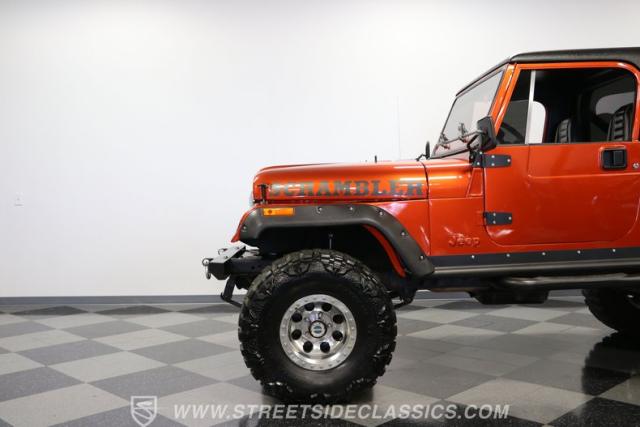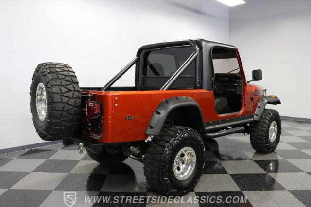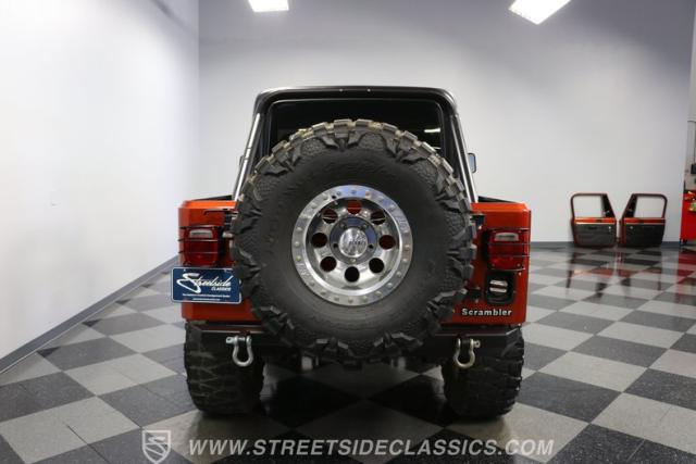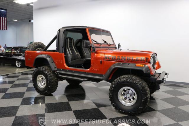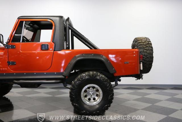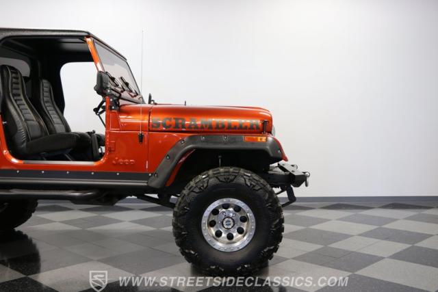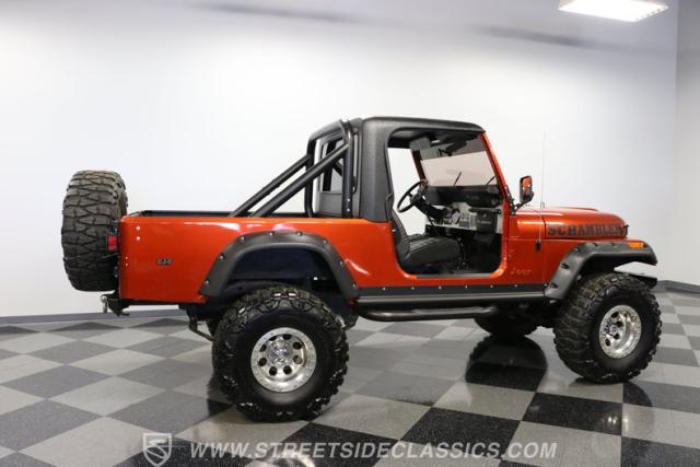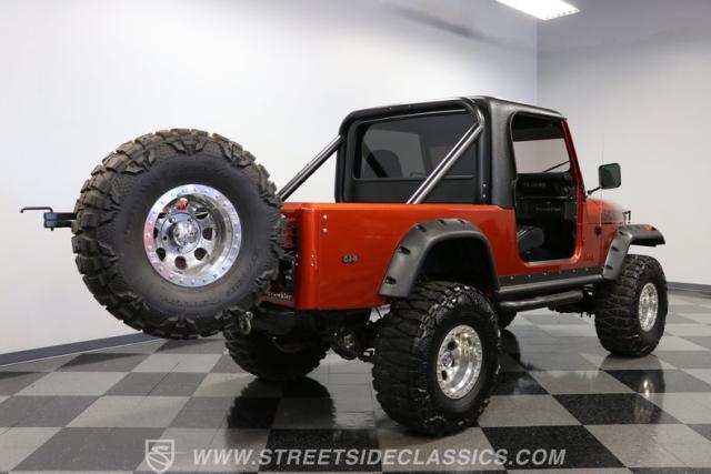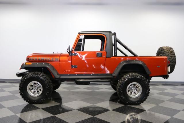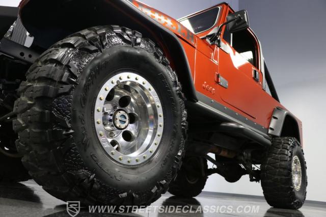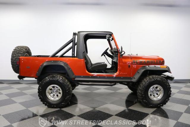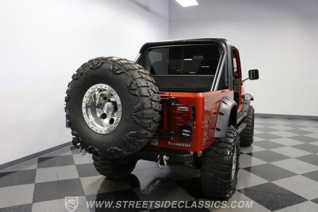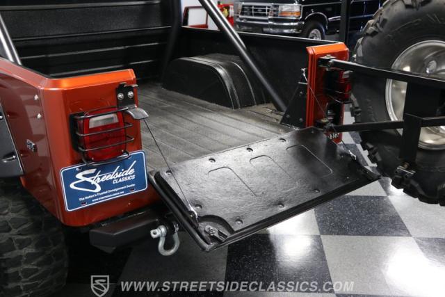 The distinction is this Scrambler\'s calling card. It has a bold Orange Metallic finish that has the kind of gloss and shine that will make you instantly stand out on the street or trail. And all that black trim and Scrambler stripe package goes excellent with the grille, wide fender flares, rock sliders, tubular side steps, hardtop roof, roll bar, tail light guards, and full rhino-lined bed. Add in the upgraded stance, meaty tires (including full-size spare,) Mickey Thompson beadlock wheels, and thick steel D-rings, and you\'ll decide that it\'s ready for off-road work no matter how pretty it is. But we also love a scrambler because its distinction goes down to its core. The face has the same CJ face that\'s at the bedrock of the SUV movement, but the production numbers are far rarer for this pickup than the other CJ siblings.
