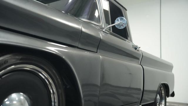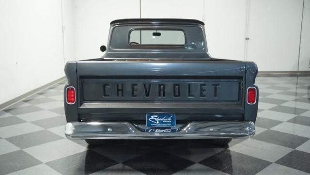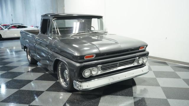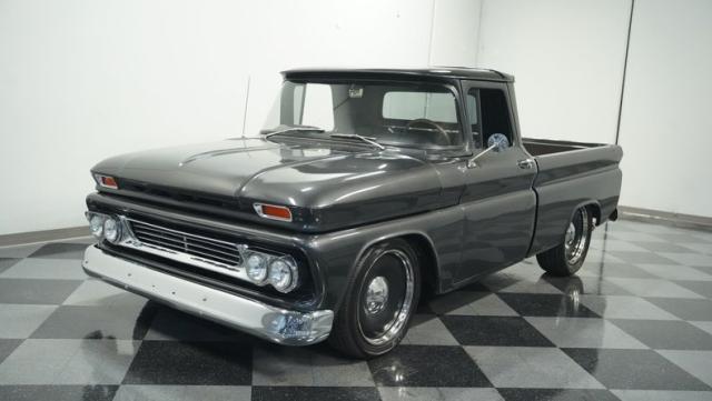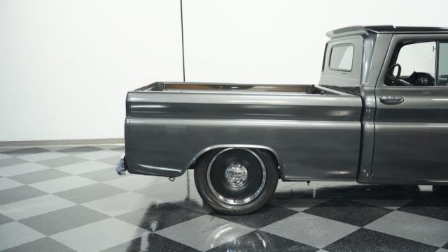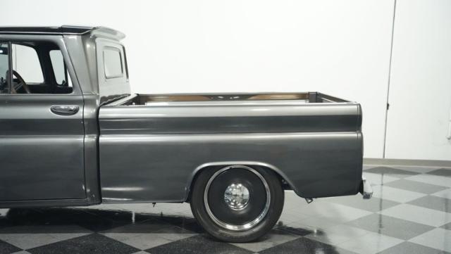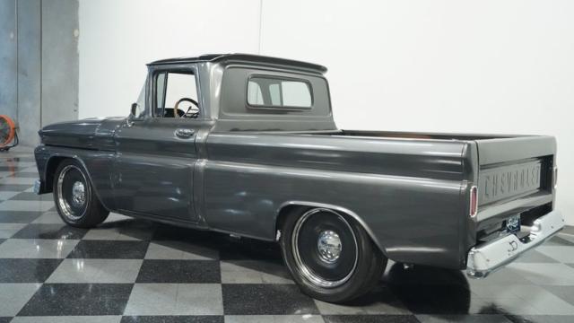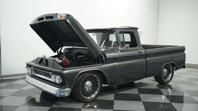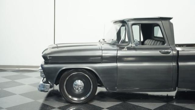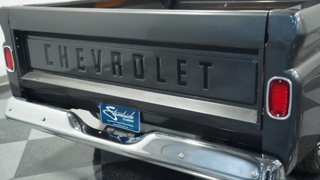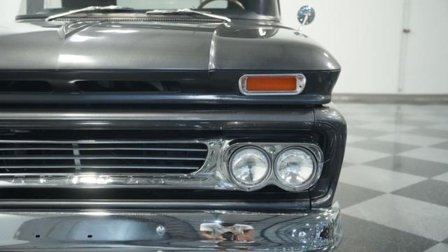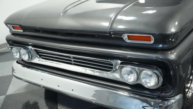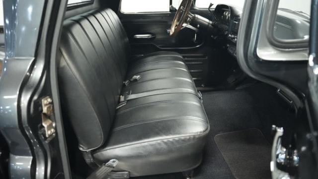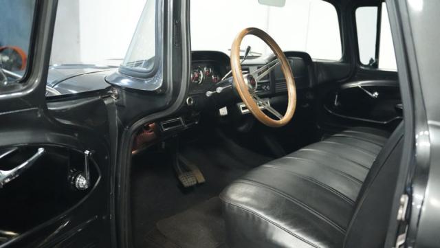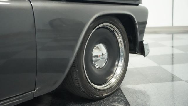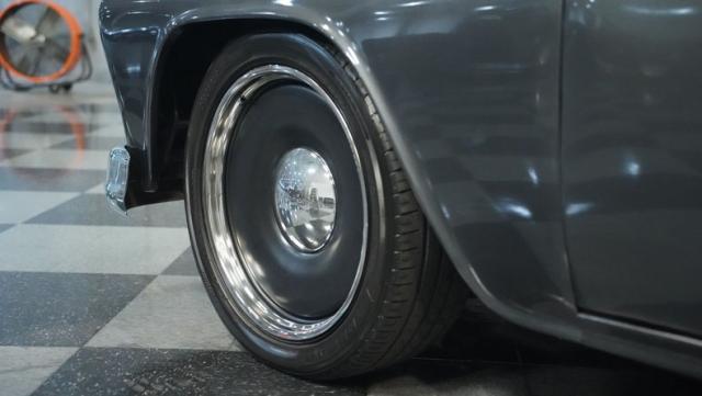 This 1961 Chevrolet Apache Restomod sports a Smoke Gray Metallic finish that contrasts sharply with its black roof. Chrome accents adorn the bumpers, grille, mirrors, and door handles, enhancing the truck\'s classic profile. The 20-inch wheels feature smooth center caps, wrapped in 245/45R20 tires up front and 265/50R20 in the rear. A freshly installed wood kit lines the bed, while subtly tinted glass and new seals complete the exterior updates. This Apache combines vintage aesthetics with modern enhancements for a unique street presence.