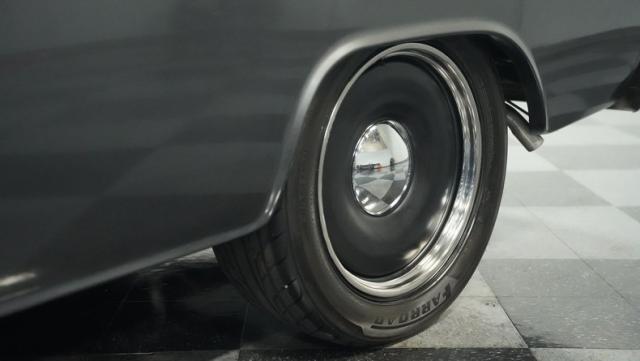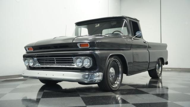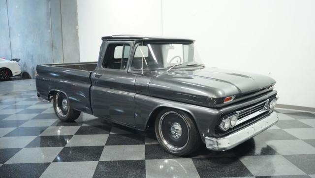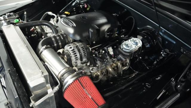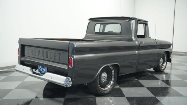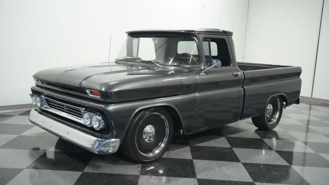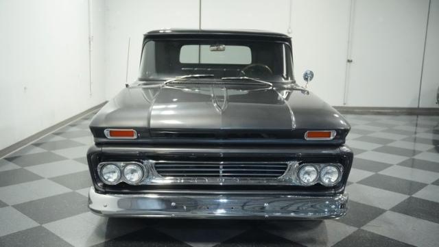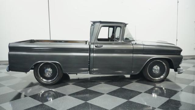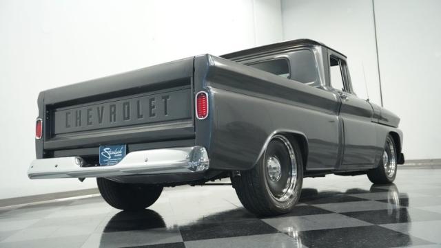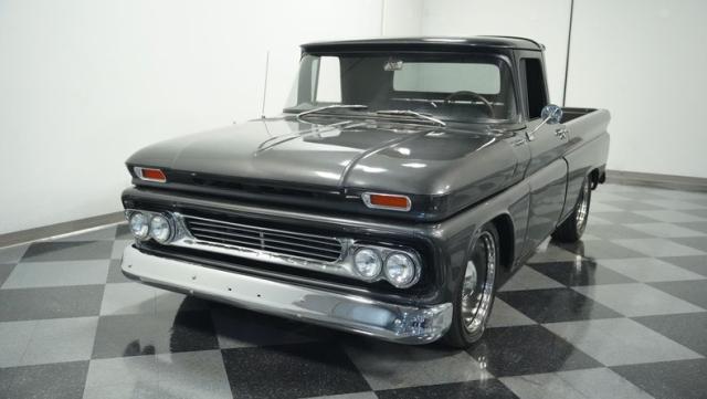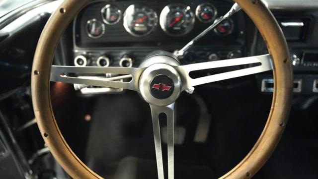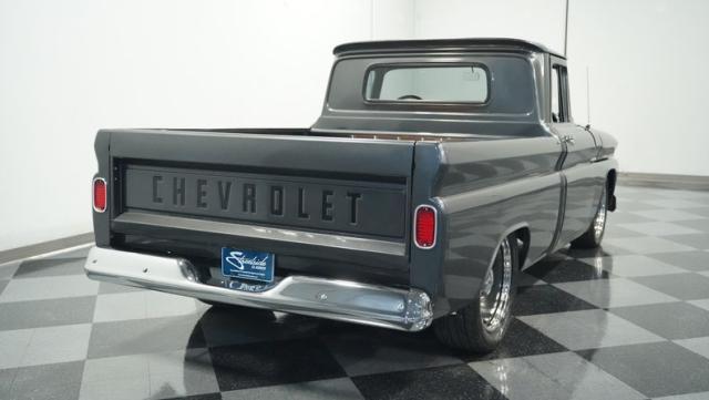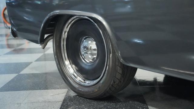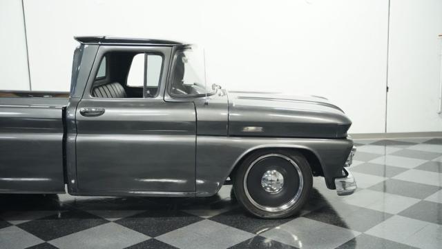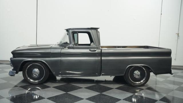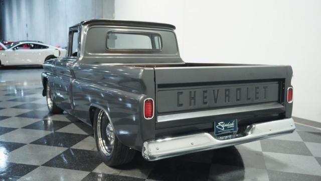 This 1961 Chevrolet Apache Restomod sports a Smoke Gray Metallic finish that contrasts sharply with its black roof. Chrome accents adorn the bumpers, grille, mirrors, and door handles, enhancing the truck\'s classic profile. The 20-inch wheels feature smooth center caps, wrapped in 245/45R20 tires up front and 265/50R20 in the rear. A freshly installed wood kit lines the bed, while subtly tinted glass and new seals complete the exterior updates. This Apache combines vintage aesthetics with modern enhancements for a unique street presence.