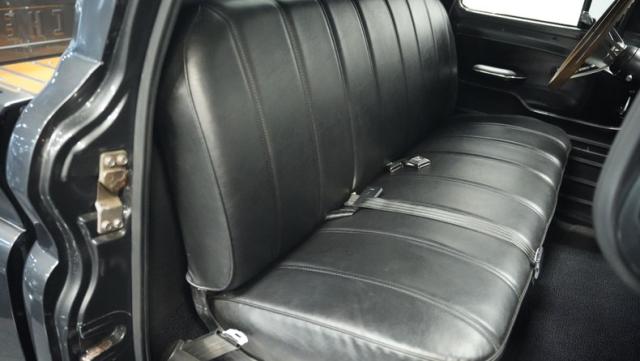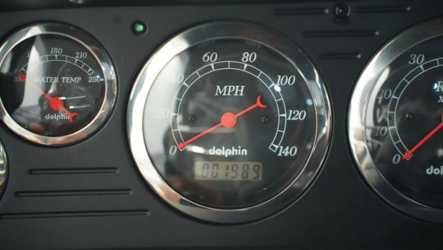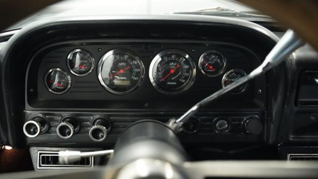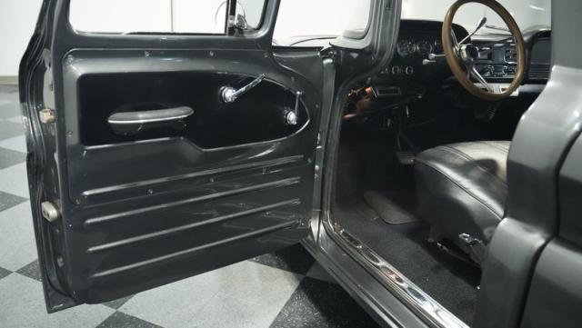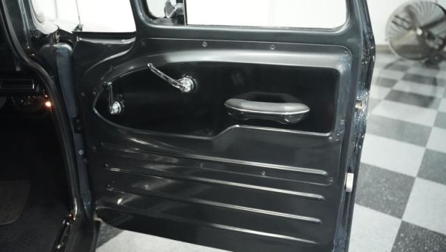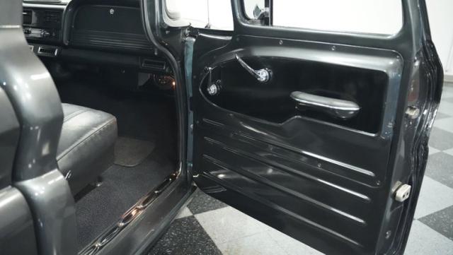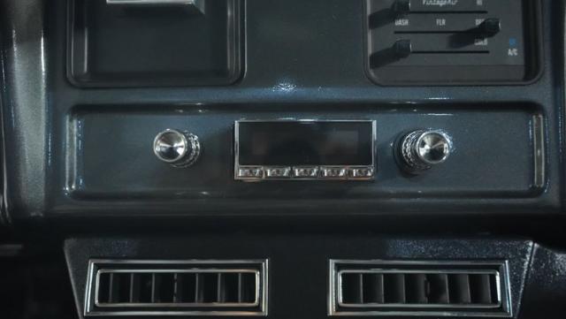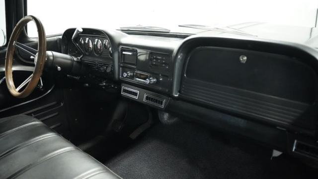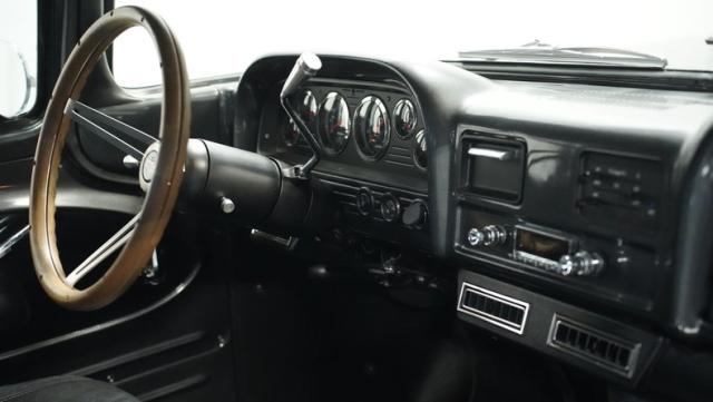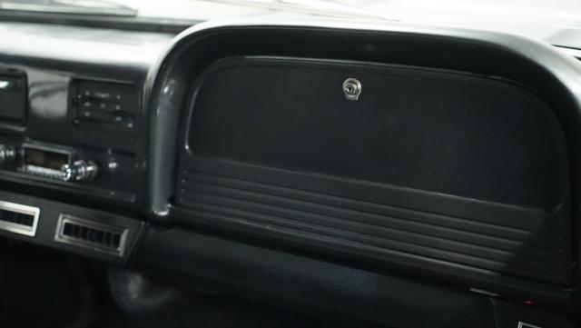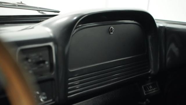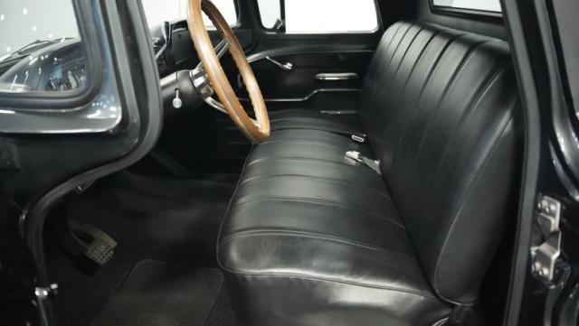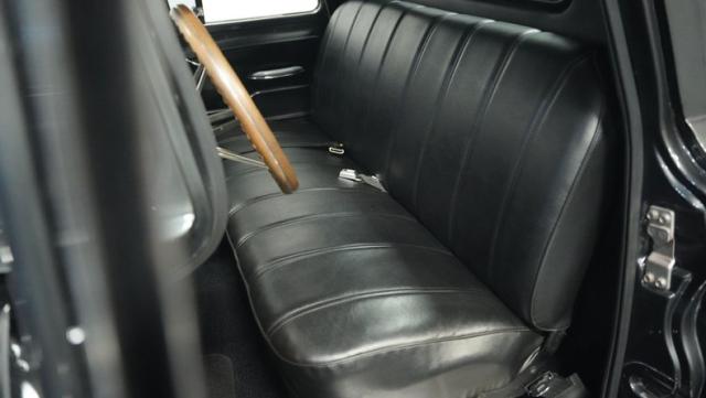 Inside, black vinyl covers the reupholstered bench seat, offering comfort for long drives. Fresh carpeting extends from the floor to the kick panels, creating a cohesive look. The dashboard houses Dolphin gauges for clear readouts of essential information. A retro-style radio with Bluetooth capability provides modern audio options, while an under-dash AC unit maintains a comfortable cabin temperature. New armrests, handles, and door seals round out the interior upgrades, blending classic style with current amenities.