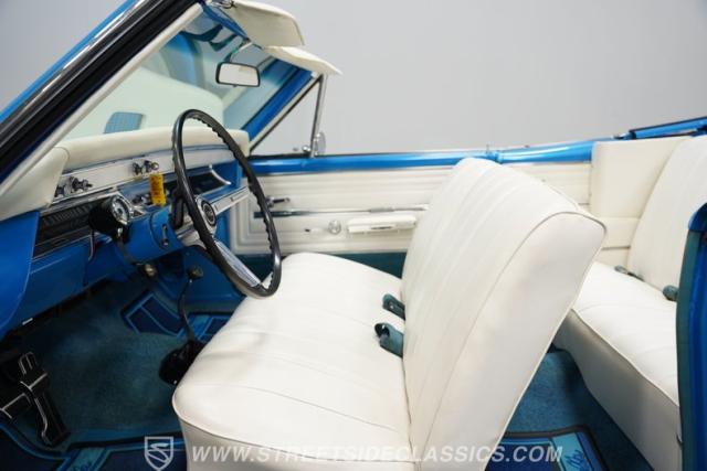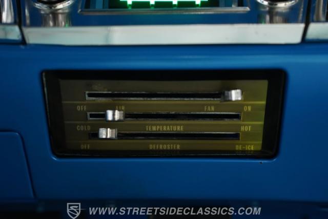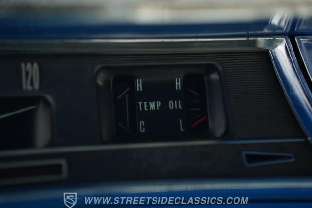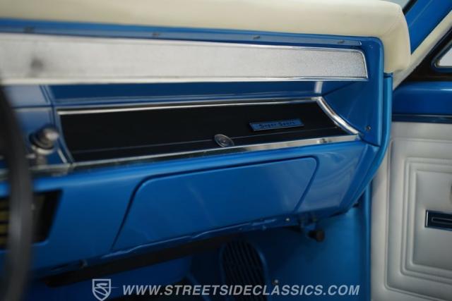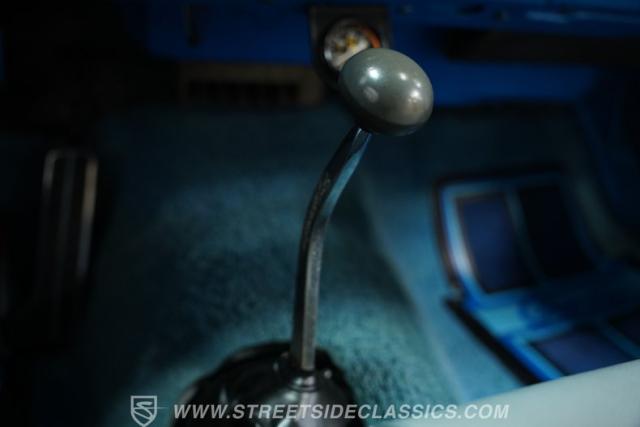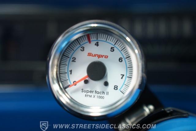 Inside, the supple white vinyl is inversely complemented by a body-color-matching trim and turquoise carpeting. A split bench seat provides plenty of room up front, while a three-spoke steering wheel featuring an SS center cap sits in front of a column-mounted Sunrpo 8,000 rpm tachometer, and beyond that, a classic horizontal 120-mph speedometer, while the throwback sliding HVAC controls (complete with air conditioning) remind us how simple driving used to be. An upgrade AM/FM/AUX head unit handles soundtrack duties, while the floor-mounted stick promises to offer up an engaging ride, whether it\'s across town or cross-country.