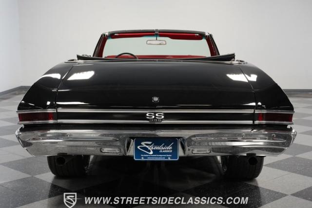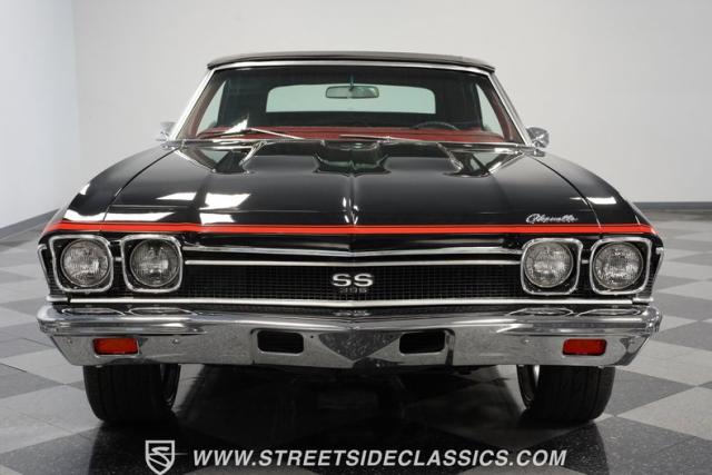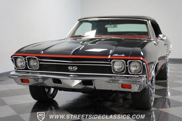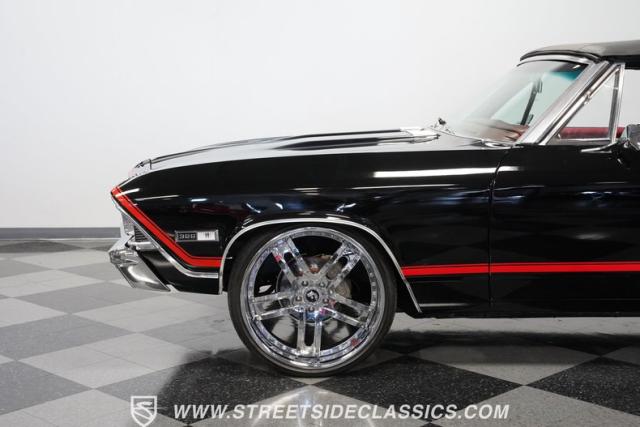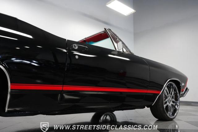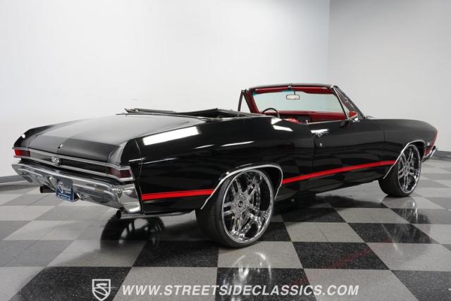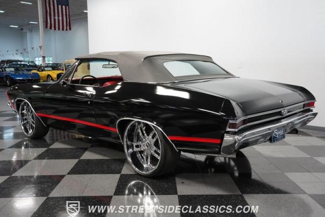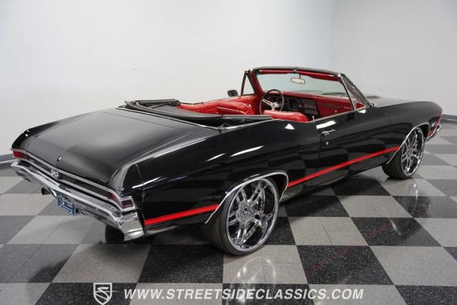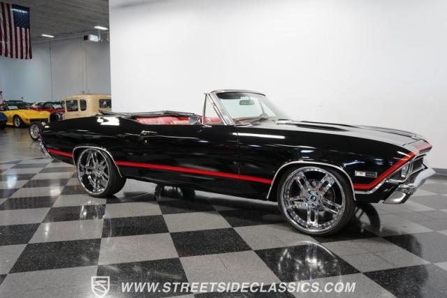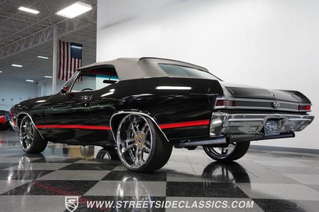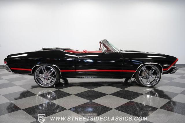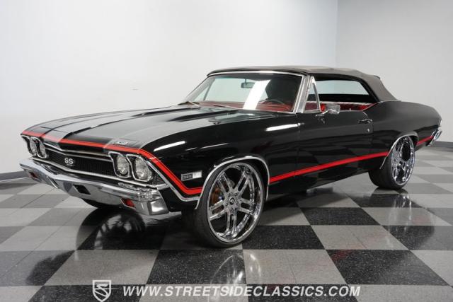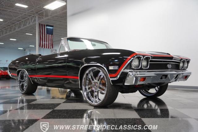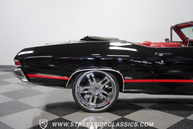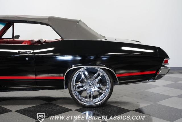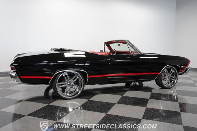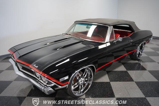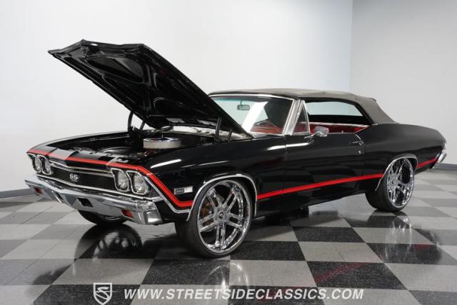 This 1968 Chevrolet Chevelle SS 396 Convertible Tribute is a sinister-looking speed demon cloaked in sleek black paint with bold red stripes slicing through its muscular body lines. Riding on massive 22\" Forgiato wheels wrapped in 245/30ZR22 front and 285/25ZR22 rear tires, this Chevelle commands the road with an authoritative stance. The dual power dome hood, SS grille, and rear panel complete the aggressive Super Sport look that strikes fear into lesser machines.
