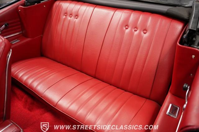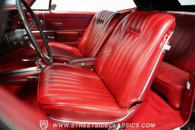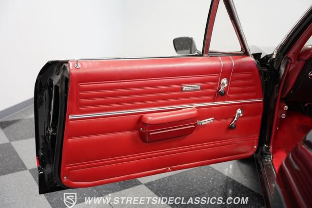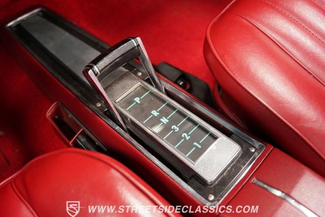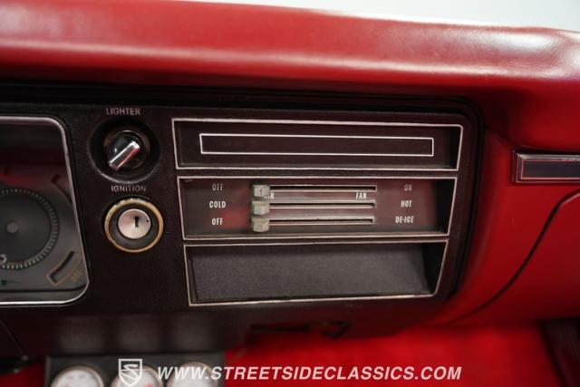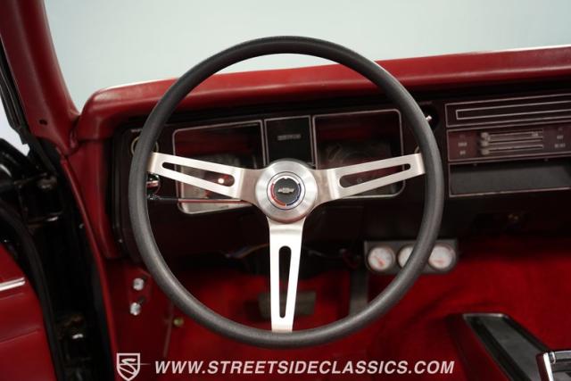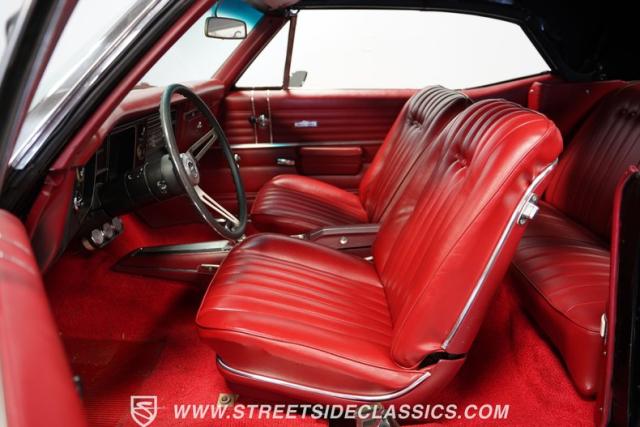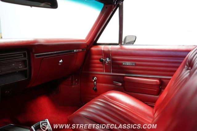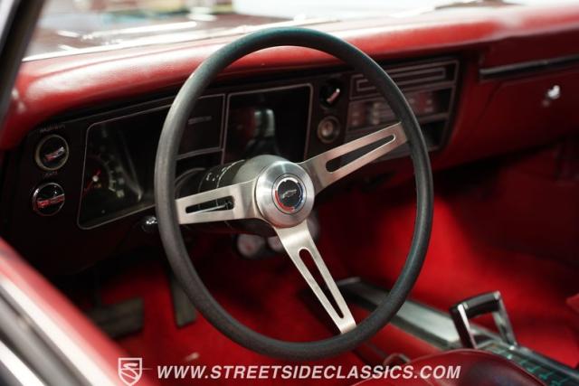 Inside, a red vinyl interior with bucket seats greets you like the warm embrace of an old friend. The vibrant color scheme carries through the dash, door panels, and console, immersing you in a sea of crimson that matches this Chevelle\'s fiery personality. Slide your hand along the console-mounted shifter, grip the wheel, and prepare for an exhilarating ride with power steering at your command. The well-restored cabin provides a comfortable environment in which to focus on what matters most - the drive.