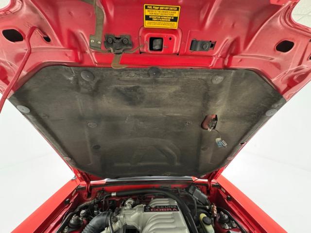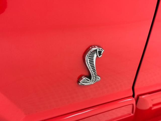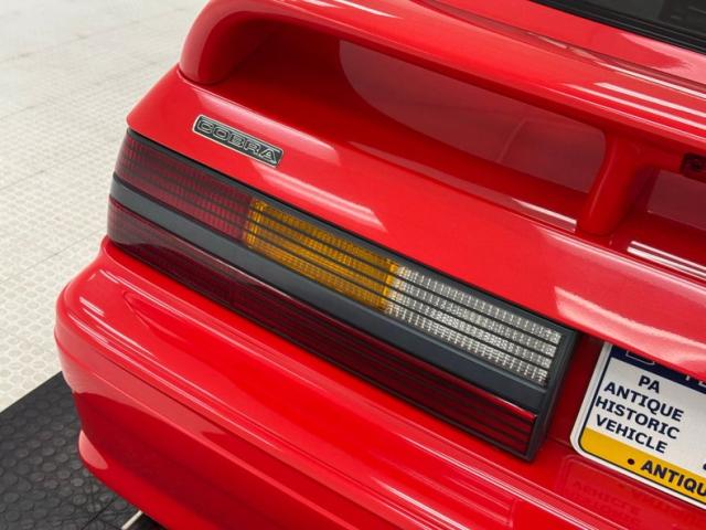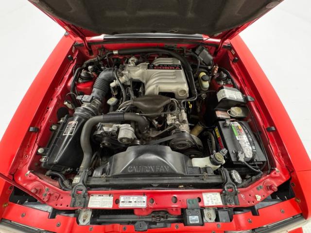 This pampered pony wears its original paint, according to our consignor, and the arrest me red, better known as Vibrant Red Clearcoat, is covering the body and the Cobra specific rocker panel extensions along with the open fascia and front and rear bumper covers. 17-inch finned wheels are also Cobra specific, here with original tires, and looking sharp on this low mileage survivor. And while we\'re looking at the profile, the unmistakable Cobra emblem looms large on the fender, striking fear into red light warriors for generations. Out back, the high rising wing is structurally grounded by four posts to the decklid over wide tail lights that are darkened by black accent ribs and midline trim, while dual exhaust chrome tips, angle cut, emerge from underneath. Rock chips along with a single, larger chip are the only imperfections on this SVT.
