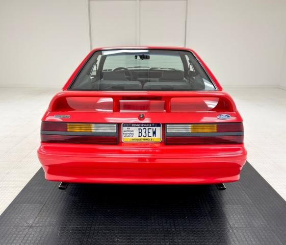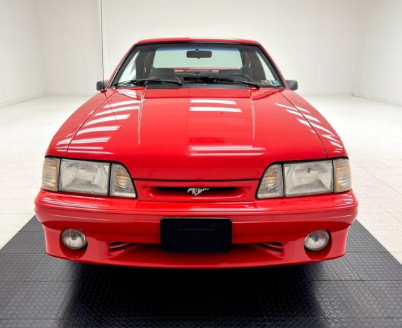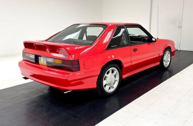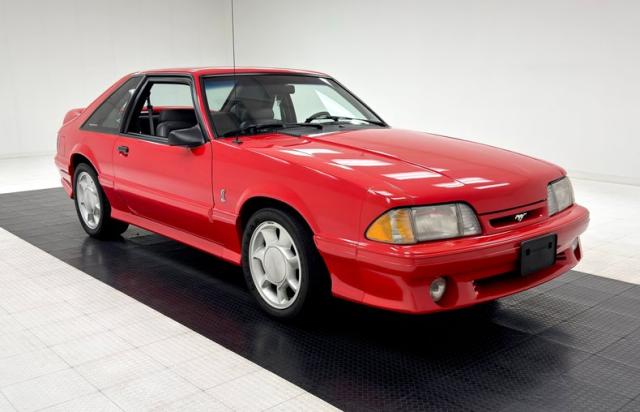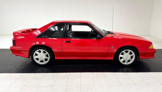 For consignment, a 1993 Ford Mustang SVT Cobra hatchback with a title verified 28,361 actual miles, a one family car and one of 4,993 produced in 1993, one of 1,007 red cars with gray leather interiors. It\'s wearing its original tires and will come to you with the window sticker, owner\'s manual, and SVT paperwork. When Car and Driver tested these cars in 1993, they recorded a 0 to 60 time of 5.6 seconds.