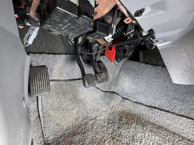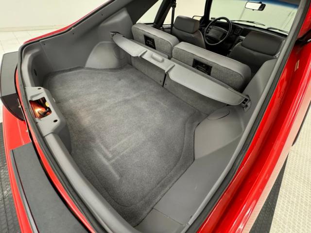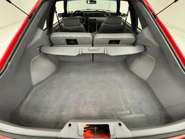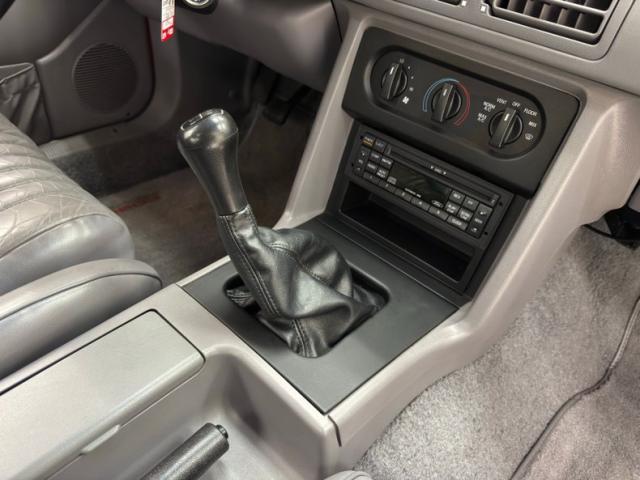 Pleated map pockets are the only extra feature you get on the door with gray door panels, standard switchgear and door pulls present. Opal Gray bucket sport seats live up front, the driver\'s showing just the slightest of patina wrinkling but equipped with the power lumbar switches. The passenger seat and rear 2+2 are immaculate. The black steering wheel holds an airbag and two small horn buttons, leading to a simple instrument panel that is classic in its analog configuration and pre-dates the time when SVT would stamp their acronym on gauges. For now, basic black dials with just the pertinent information without variance from the mass produced GT. Simple too is the center stack with dials for A/C control and an AM/FM/CD radio leading to the shifter in a matching black plastic base and adorned with a black leather boot over gray plastic. Medium pile gray carpet covers the floor with factory Cobra carpeted mats over top. Under the hatch, more gray carpet covers the storage floor with a near pristine presentation.