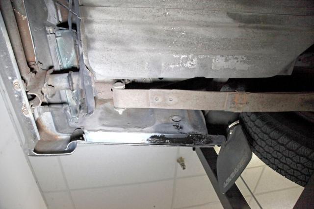 Patina and surface rust is noted throughout. There is invasive rust on the left front unibody rail that has been painted over with fresh black paint but it\'s still there. The floor pans are solid and there is a cherrybomb glass pack style muffler on an otherwise rusted exhaust pipe. Suspension is front transverse torsion bars and rear leaf springs. Braking is front power discs and rear power drums.