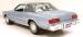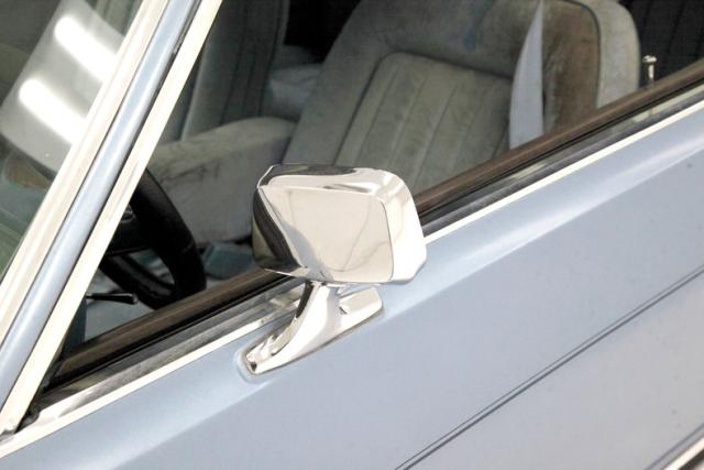 Cadet Blue Metallic covers steel panels all squared off and minding gaps very nicely. In front we see a lazy V outward facing grille with a central egg crate design and a grid of dual head lighting on the bottom with square headlights above dual horizontal running lights to match the lower headlight size. These lights wrap around the corner of the front quarter and emulate the shiny bumper below. A radiator surround is in the blue and a hood ornament is atop. The hood starts its journey rearward to the windscreen which is initially topped with metal roof then it turns to vinyl covered darker blue and we can call it a true landau top with a vertical rectangular opera glass insert. Some darker blue pin striping is highlighting the edge of the body bump out and does a great job of doing so especially on the rear quarter which uses one of the few curved surfaces in the bump out. A nice spacious trunk frames wide rectangular horizontal tail lights made up of 3 squares and trimmed by thin chrome edging. A C H R Y S L E R badge is noted on the bottom edge of the lid and a shiny bumper with inset backup lighting is below. The car rides on 15-inch dinner plate hubcaps and wheels which are wrapped in 215/75R15 thin whitewall rubber.