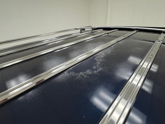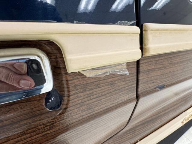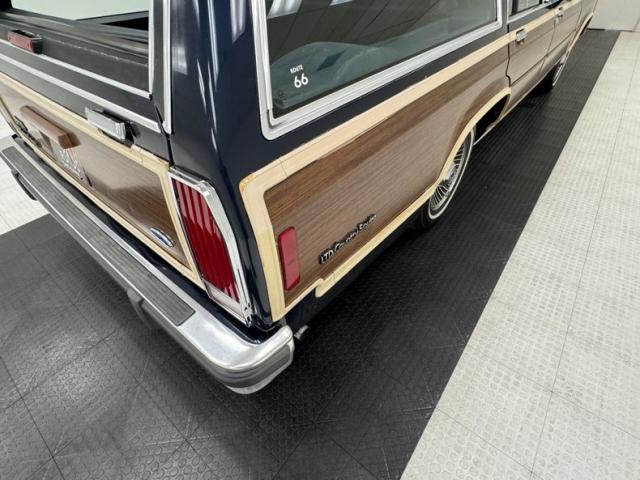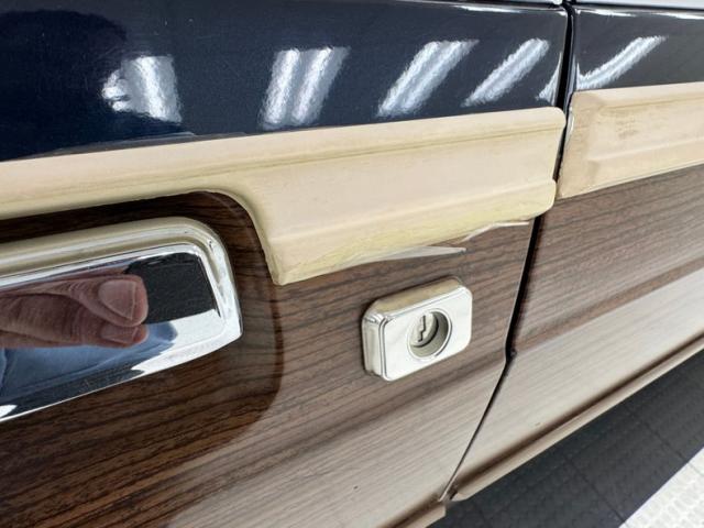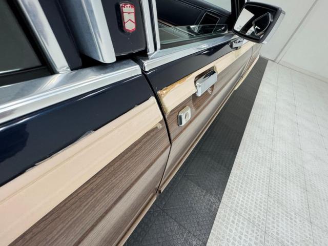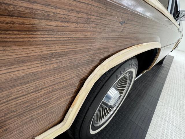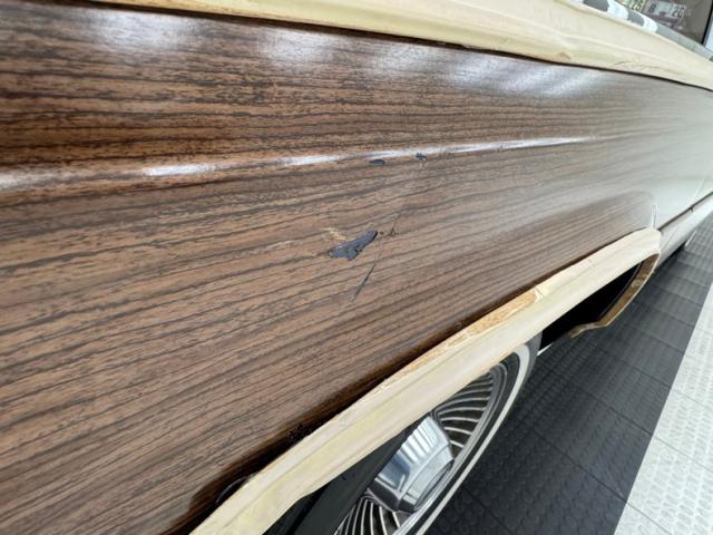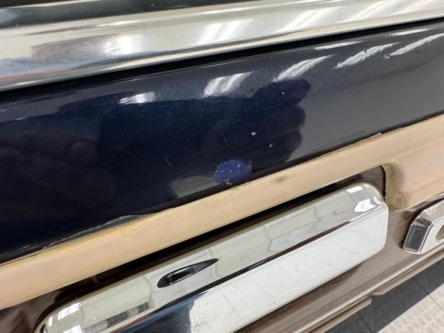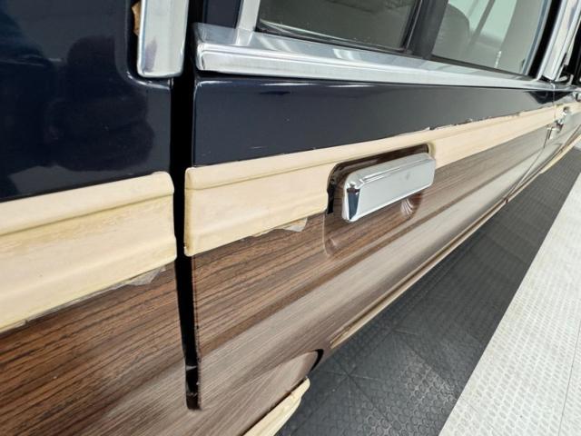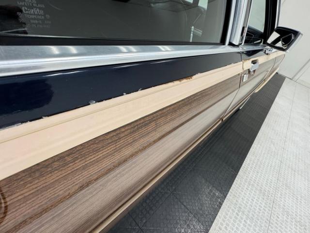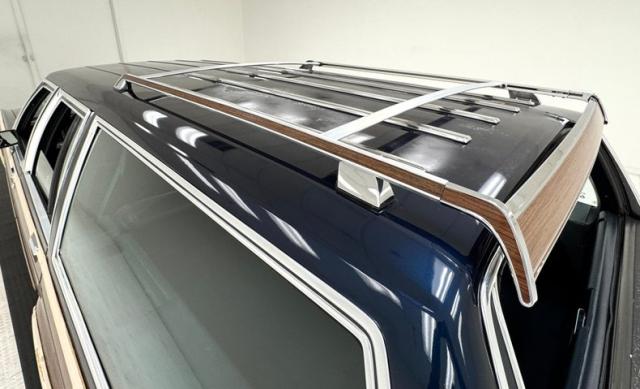Our time capsule begins with two stage Twilight Blue Metallic paint covering the long panels and boxy profile. Long rear side windows start where the sedan would end, and the rear overhang is almost as long! The chrome framed grille and bezels are upright over a large, chrome bumper. The hood goes on forever just before the raked windshield takes over and lifts the roof high, allowing for large windows that create an airy feel and open greenhouse. The roof rack is an attractive piece, adorned with matching woodgrain decals that add a welcome dimension to the roof line. Eleven years earlier, National Lampoon\'s Vacation would double the tail lights on their LTD wagon, but we think it\'s much more attractive in factory form, handsome lenses bookending the tailgate and embedded third brake light. Imperfections include some clear coat deglazing on the roof and rear door windowsill, a scratch in the wood over the front wheel, touched up chip, lots of delamination on the light \"wood\" framing, 2 rock chips in the windshield, some bubbling and chips down low, and various scratches.