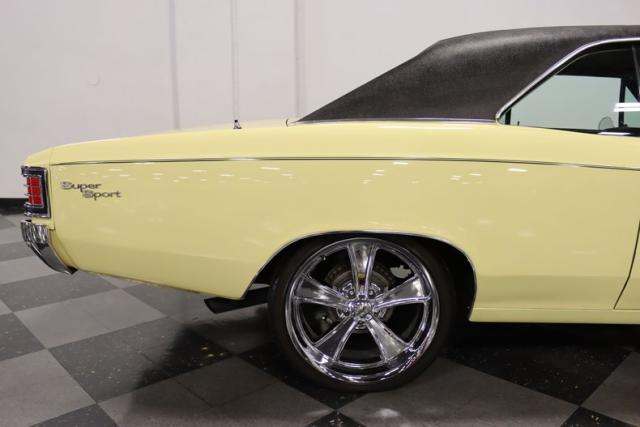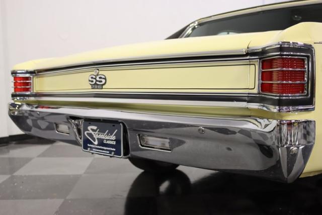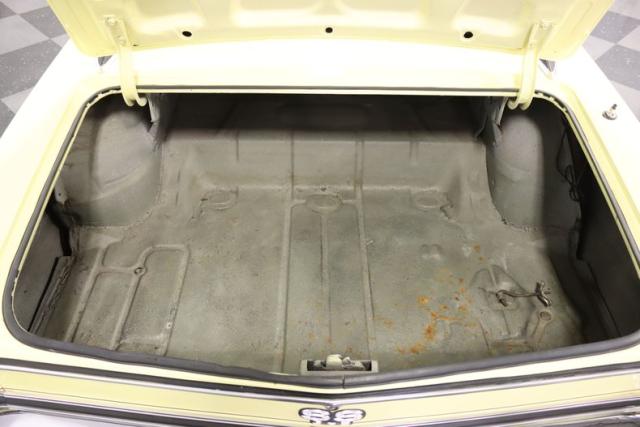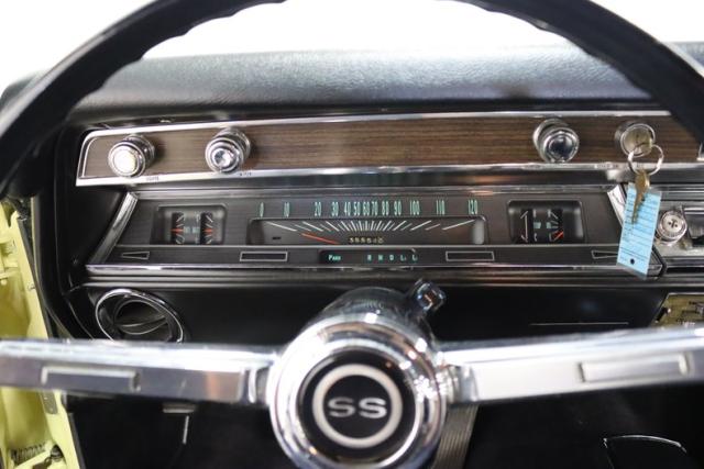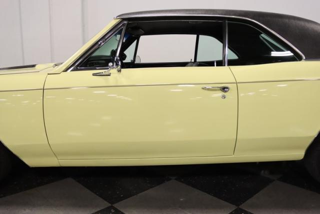 Butternut Yellow is a great factory color on a Chevelle like this. It seems to represent its era correctly in a bright and distinct way. Plus, it makes for a nice contrasting backdrop to the premium dark elements like the well-fitting black vinyl roof, and the full-length pinstripe that highlights how well the door fit. The Super Sport badging, hood vent trim, and pillar-less hardtop profile are all part of that ideal muscle car look. Fresh chrome bumpers and upgraded polished Coys wheels add plenty of shining charm, but there\'s nothing too overdone so that you\'re afraid to be the first to break in fresh asphalt with this big block cruiser.